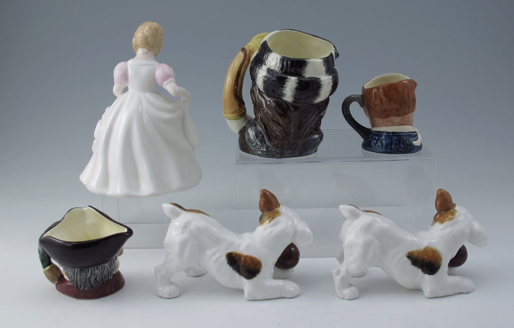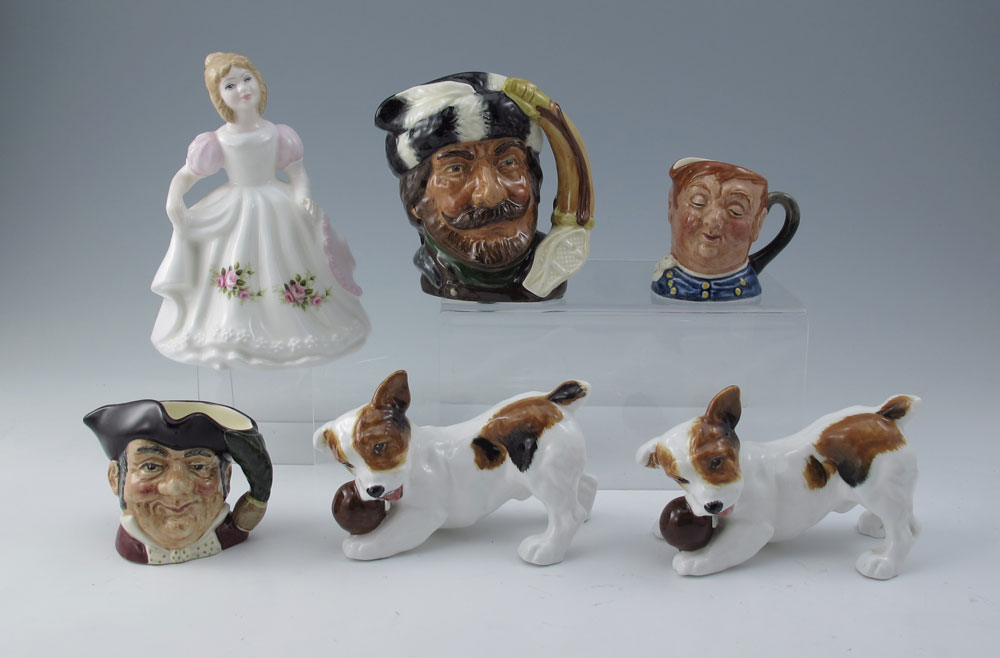 6 ROYAL DOULTON FIGURINES AND JUGS: To include 1) The Trapper D6612 jug, 3 3/4'' h.. 2) Mine Host jug D6513, 2 3/8''. 3) Fat Boy jug, 2 1/4''. 4) June Figure of the Month HN 3323 5 1/4''. 5) Pair of terriers playing with balls, HN 1103, 2 1/2'' h.