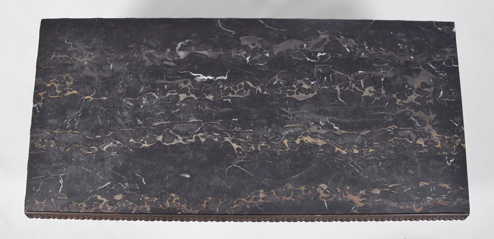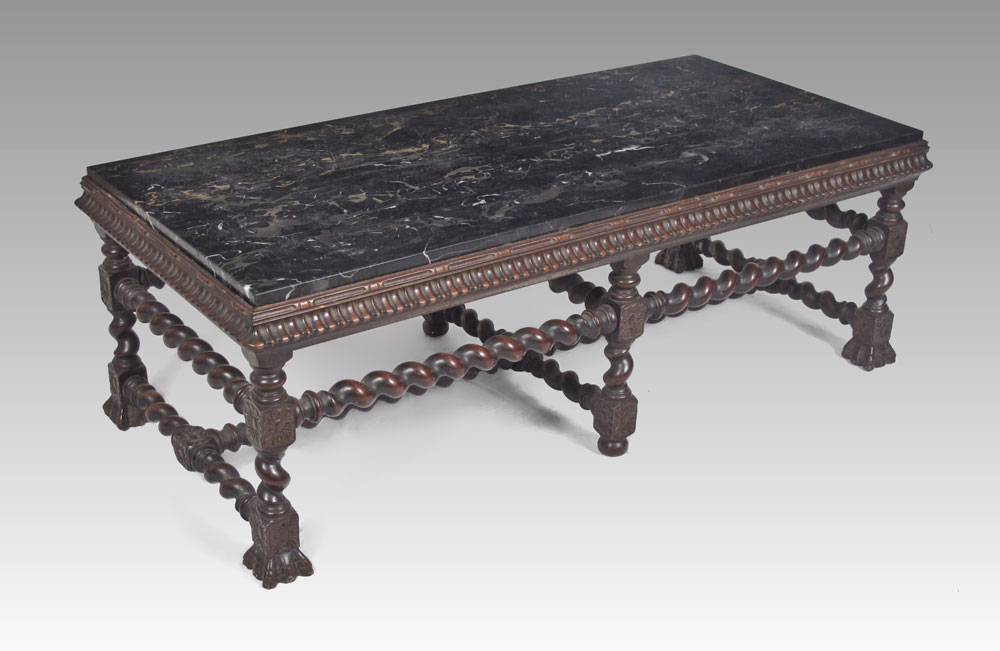 CARVED MARBLE TOP COFFEE TABLE: Carved base with barley twist stretchers on 6 carved feet. Heavy black marble top. 17 1/4'' h. x 50 3/4'' x 24''.
