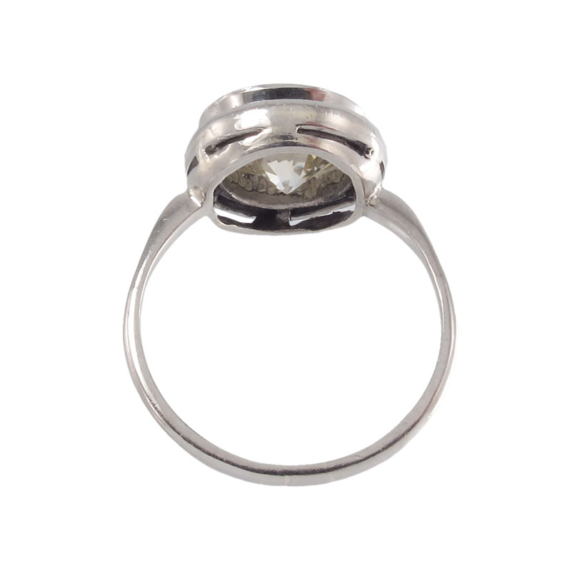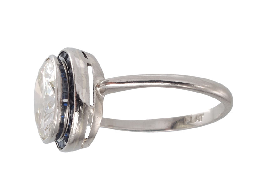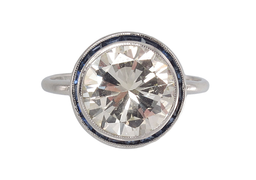 3.86 CT DIAMOND SOLITAIRE RING FRAMED IN SAPPHIRES: Platinum ring centers an approx. 3.86 Ct diamond, rated VS1 in clarity and O-P color. 20 French cut sapphires, approx. .25 Ct. frame the diamond. Diamond and sapphires are prong set. Size 7.5. Weight 4.7 grams. Sold with current Atlanta Gemological GIA graduates appraisal for $40,000.