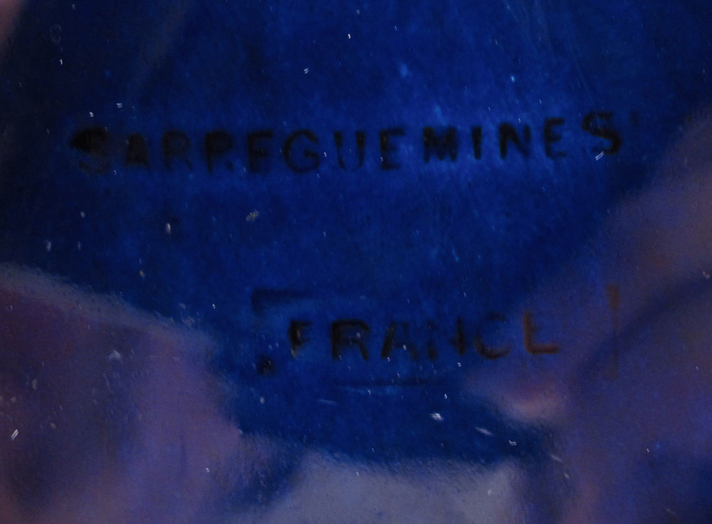SARREGUEMINES PORCELAIN BRONZE MOUNTED CENTER BOWL: Cobalt blue with gold decoration with bronze mounts and handles. Marked Sarreguemines France Dec. 2251. 7'' h. x 20 1/2'' x 8''.
