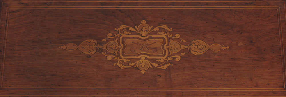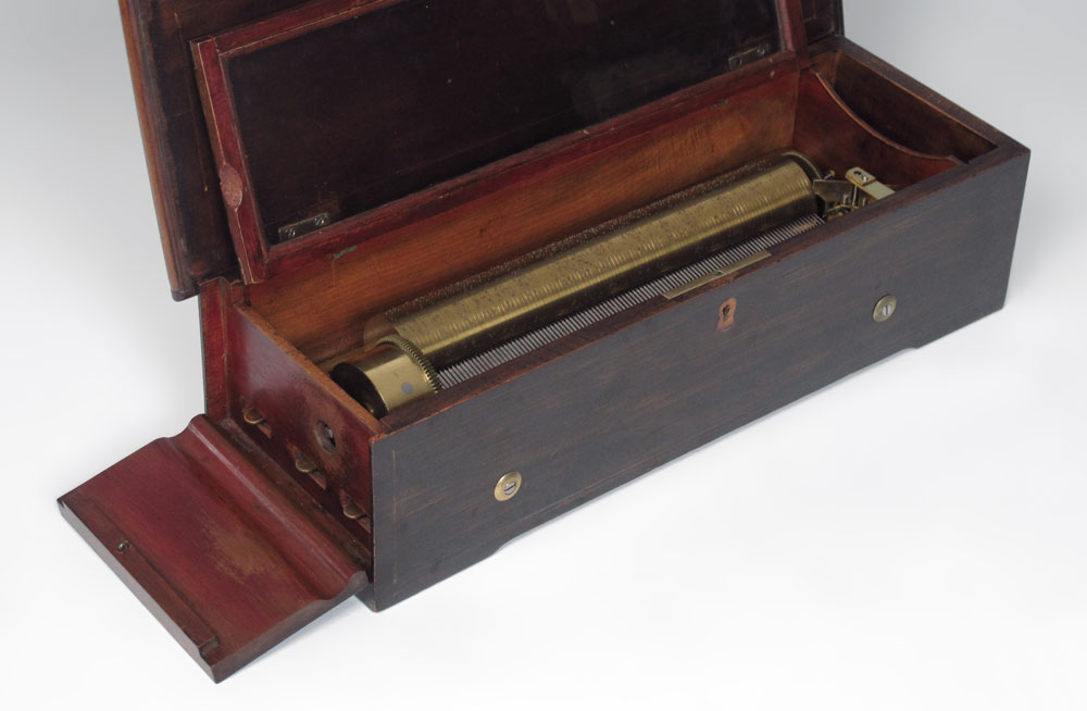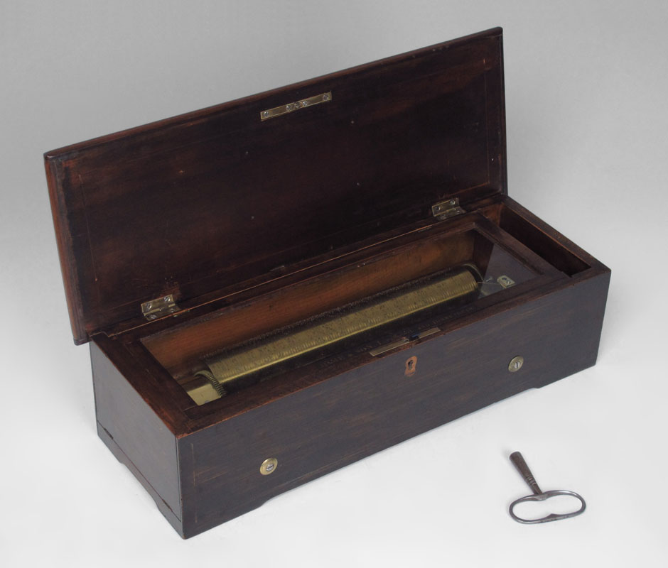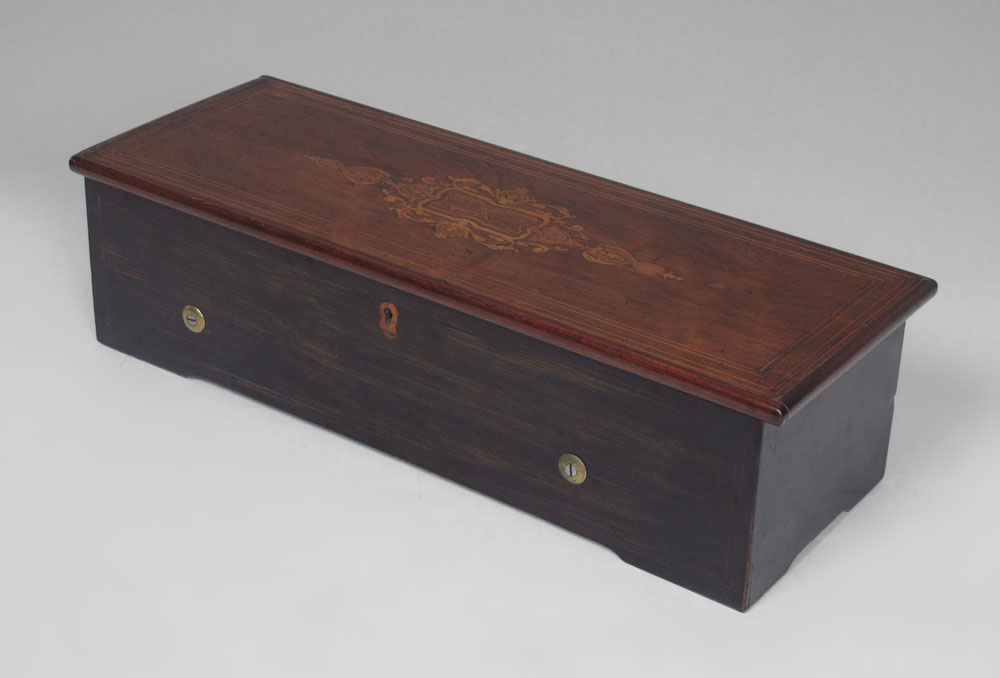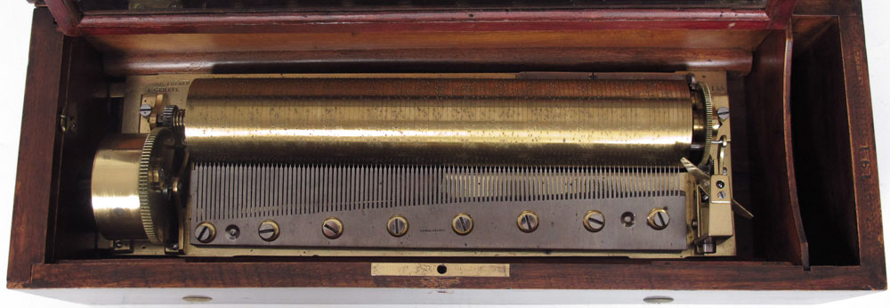 NICOLE FRERES SWISS INLAID CYLINDER MUSIC BOX: The single comb components were made by the renowned Geneva firm of Nicole Freres. Marked A GENEVA (Switzerland) with a stamped number 39136. The case is of fine inlaid rosewood, case is marked Hime & Son, Liverpool & Birkenhead. It has three controls on the end of the box, within a door that opens on the left end. One control is an on / off lever. The second is to select a repeat of the last song or switch to continuous play of the 6 tunes / airs. The third selects continuous play or stop after playing the six songs. This is the end where the spring is wound, with a key which is included. Measures 5'' x 18 1/2'' x 7''.