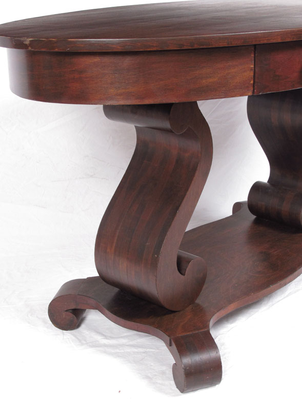 EMPIRE STYLE LAMP TABLE: Mahogany one drawer table with oval top joined to lower tier by double scrolled pedestal. Scrolled feet. 28 1/4'' h. x 46 1/2'' x 28''.