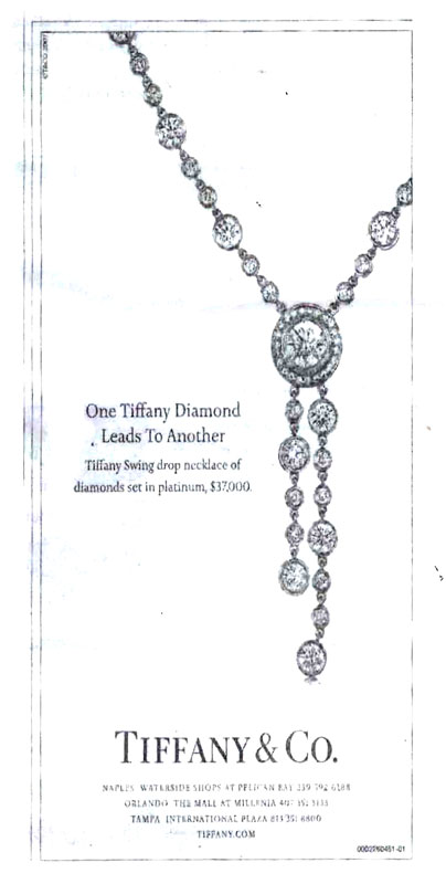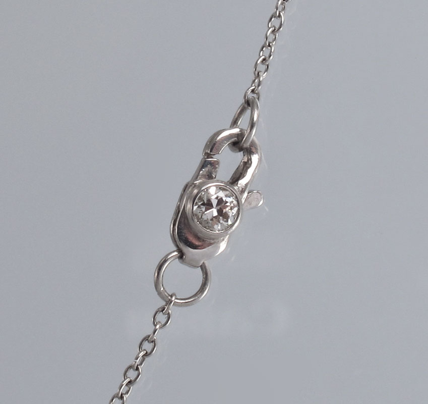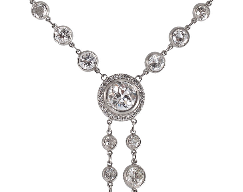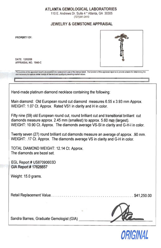 TIFFANY INSPIRED PLATINUM SWING DROP NECKLACE OF DIAMONDS: Hand made platinum necklace of 12.14 Ctw diamonds featuring one Old European round cut diamond, approx. 1.07 Ct., rated VSI in clarity and H color. 59 old European round, brilliant and transitional brilliant cut diamonds. approx. 10.9 Ct., VS-SI in clarity and G-H-I color. The remaining 27 round brilliant diamonds weigh approx. .17 Ct, VS clarity and G-H color. Diamonds are bezel set. Weight 15 grams. Sold with current Atlanta Gemological GIA graduates appraisal for $41,250.