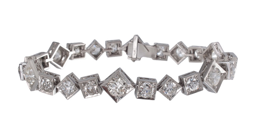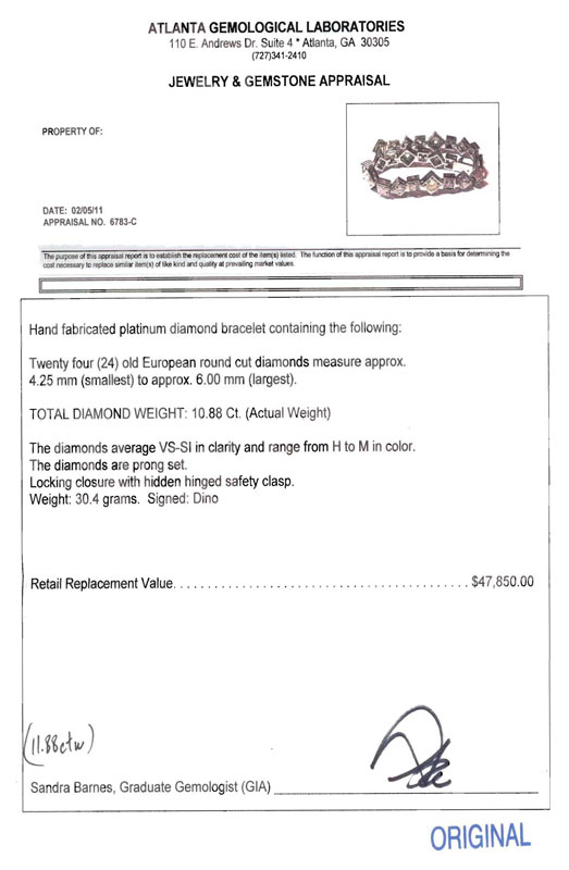 PLATINUM 10.88 CT DIAMOND BRACELET: Custom hand crafted platinum link bracelet of 24 old European round cut diamonds, all totaling 10.88 Ct., averaging VS-SI in clarity and H-M color. Diamonds are prong set. Locking closure with hidden hinged safety clasp. Weight 30.4 grams. Signed Dino. Sold with current Florida Diamond Appraisers GIA appraisal for $47,850.