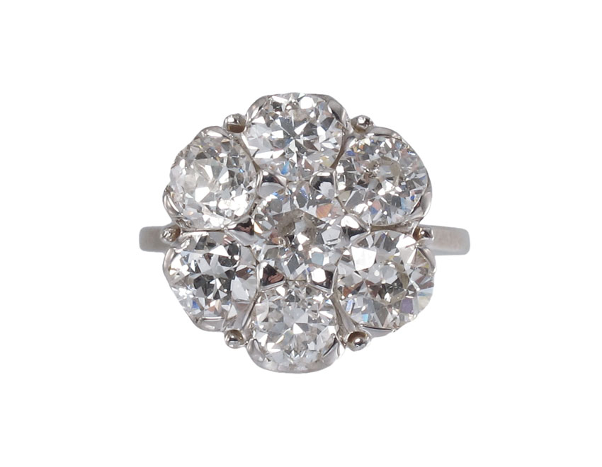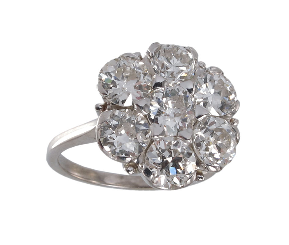 DIAMOND CLUSTER RING: 14K white gold ring show off 7 old European cut and old mine cut diamonds, all totaling approx. 3.54 Ct., averaging VS1-SI2 in clarity and H-I-J in color. Weight 5.8 grams. Diamonds are prong set. Sold with current Atlanta Gemological GIA graduates appraisal for $11,250.
