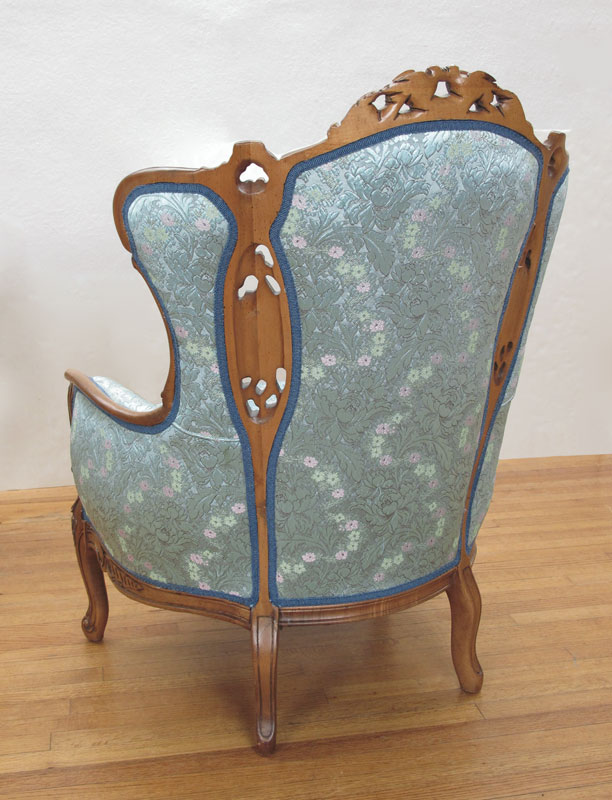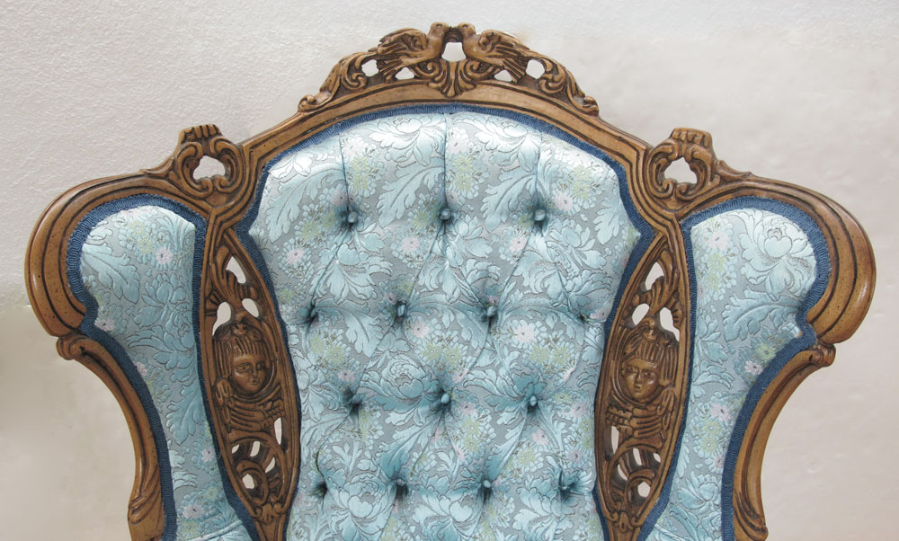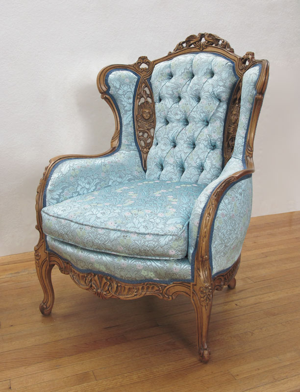 DEUTCH BROTHERS HEAVILY CARVED WINGBACK CHAIR: Profusely carved with figural birds and masquerons. Floral blue upholstery. 43'' h. x 32'' x 33 1/2''.