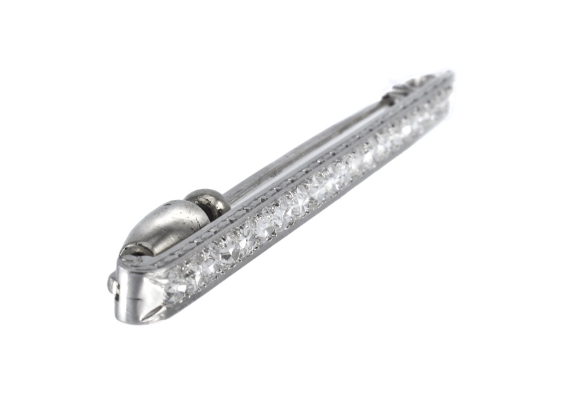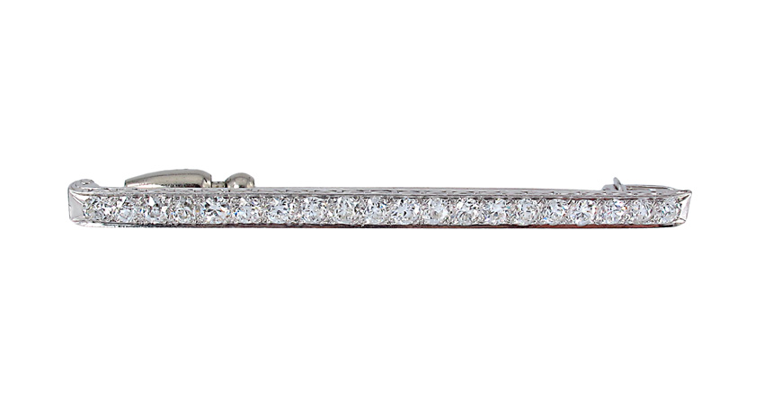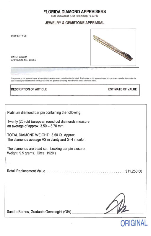 PERIOD 1920'S PLATINUM DIAMOND BAR PIN: Platinum bar pin of 20 old European round cut diamonds, all totaling approx. 3.5 Ct. Averaging VS in clarity and G-H color. Diamonds are bead set. Locking bar pin closure. Length 3''. Weight 9.5 grams. Sold with current Florida Diamond Appraisers GIA graduates appraisal for $11,250.