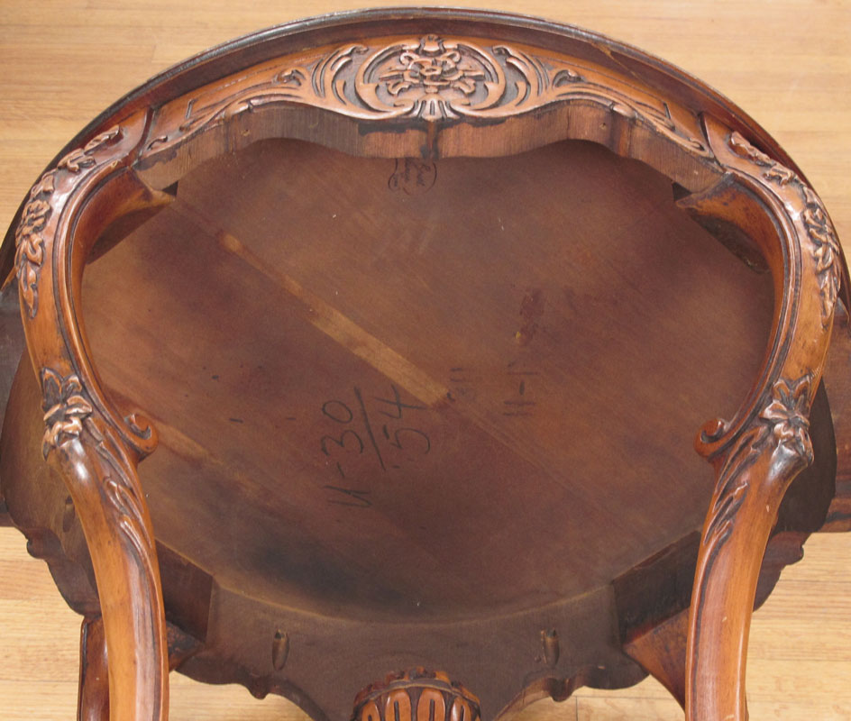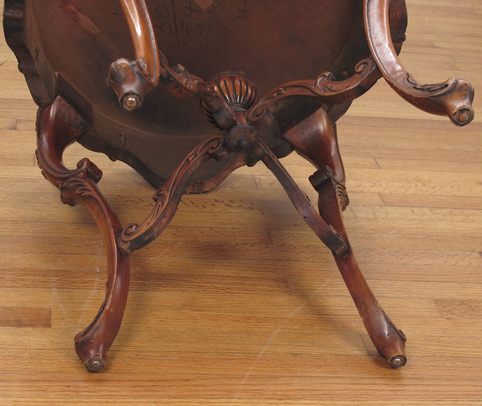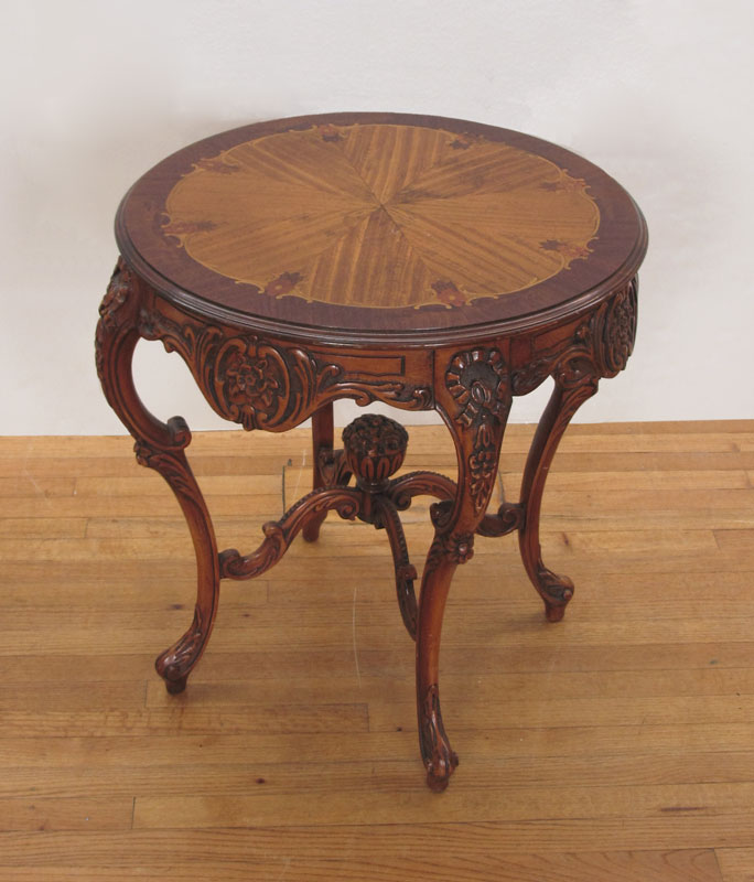 DEUTCH BROTHERS CARVED & INLAID CENTER TABLE: Inlaid top with florettes, profusely carved sides and legs. Carved urn finial center of stretcher. 28 1/4'' h. x 26''.