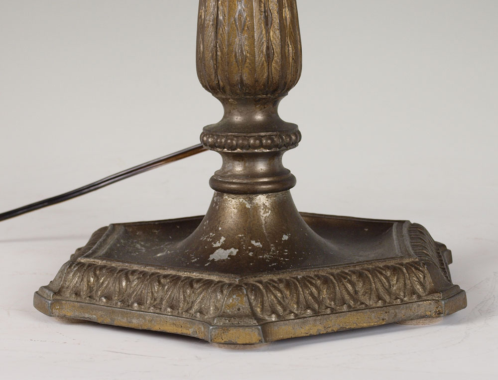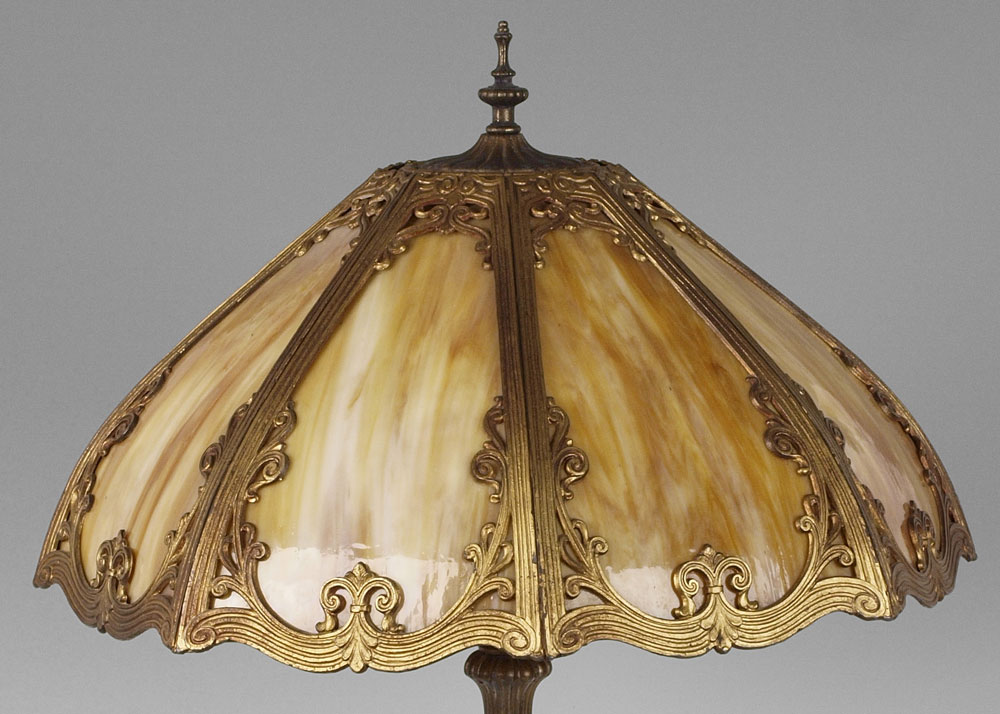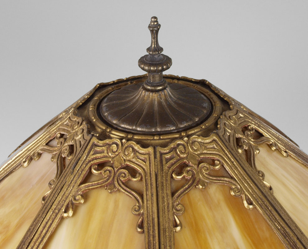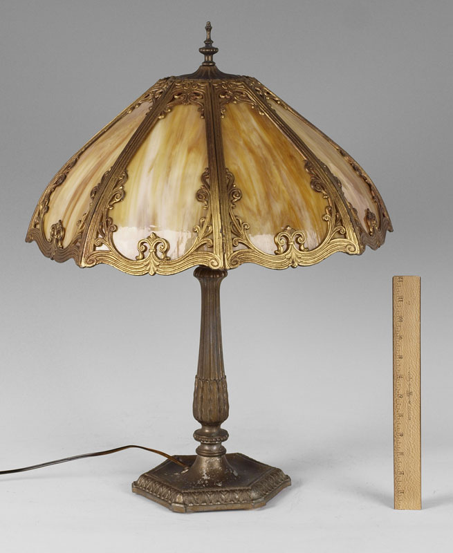 VINTAGE SLAG GLASS TABLE LAMP: The domed shade having 8 panels of caramel slag glass under metal filigree. Double socket, pull chains. Shade measures 23 1/2'' dia., lamp 24'' tall overall.