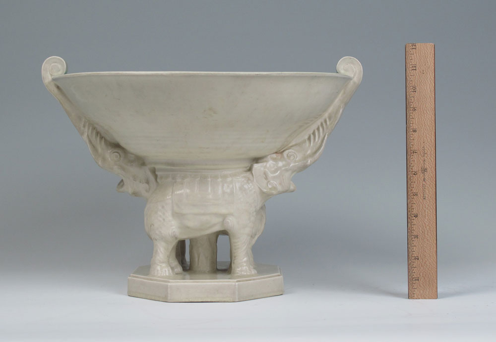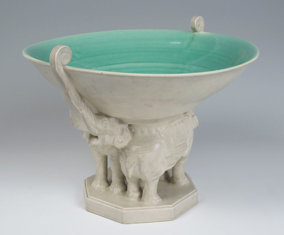 UNUSUALLY LARGE ROOKWOOD AMERICAN ART POTTERY ELEPHANT COMPOTE 2512: Date mark 1922. 11'' h. x 16'' x 15''. Harvey Hanaford Miller/Charles Wiedemann Collection.