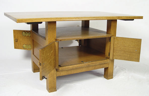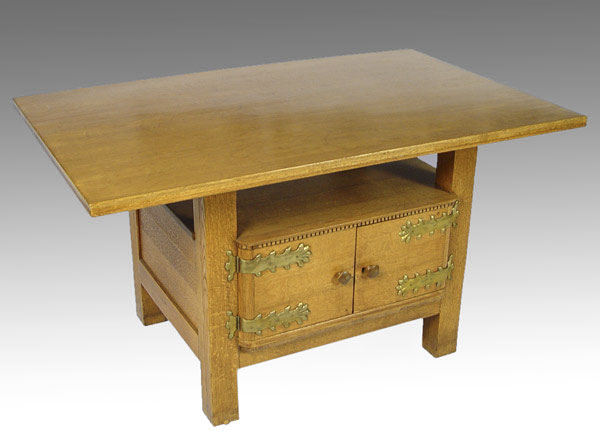 AESTHETIC MOVEMENT GOLDEN OAK CENTER TABLE: 2 door storage compartment base. 28 1/4'' h. x 52'' x 32''