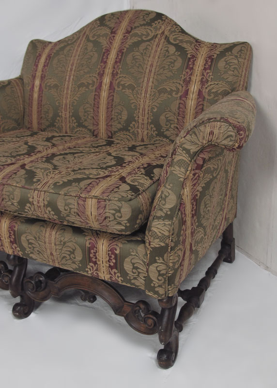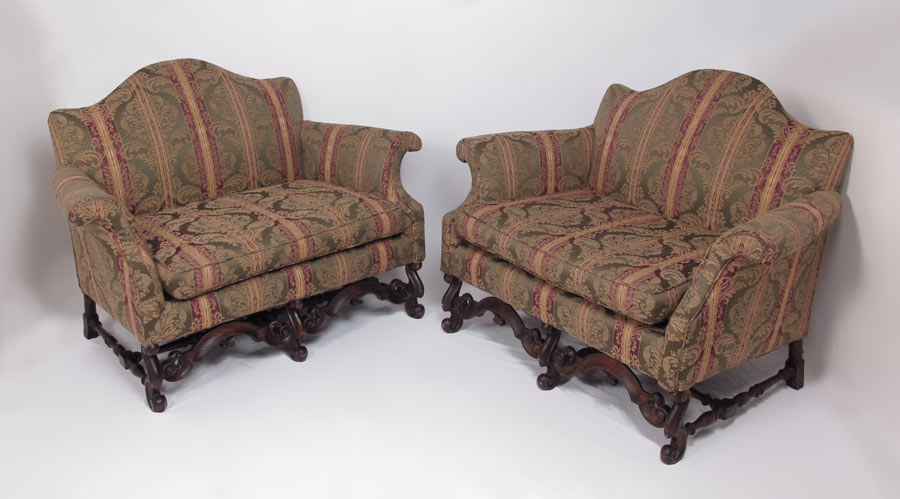 PAIR OF CHIPPENDALE STYLE SETTEES: Flemish mahogany legs and stretchers, single cushions, hump back, rolled arms, A cozy 38'' tall x 51'' wide x 36'' deep.