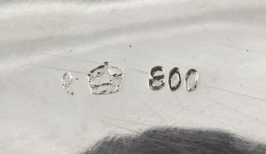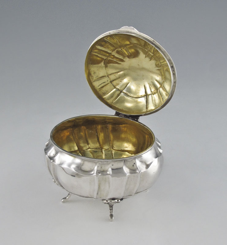 GERMAN 800 SILVER HINGED LID BOX: Hinged lid opens to reveal vermeil interior, box on 4 applied feet. Marked with German 800 silver marks. 3 1/2'' h. x 4 1/2''. Approx. 8.1 troy oz.