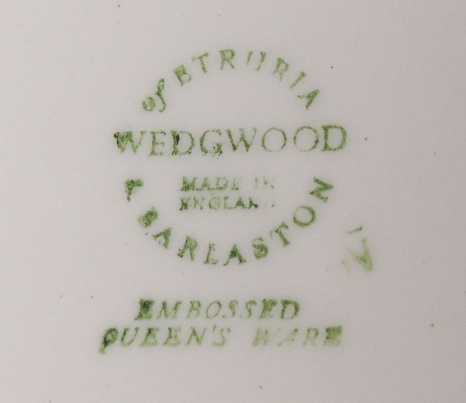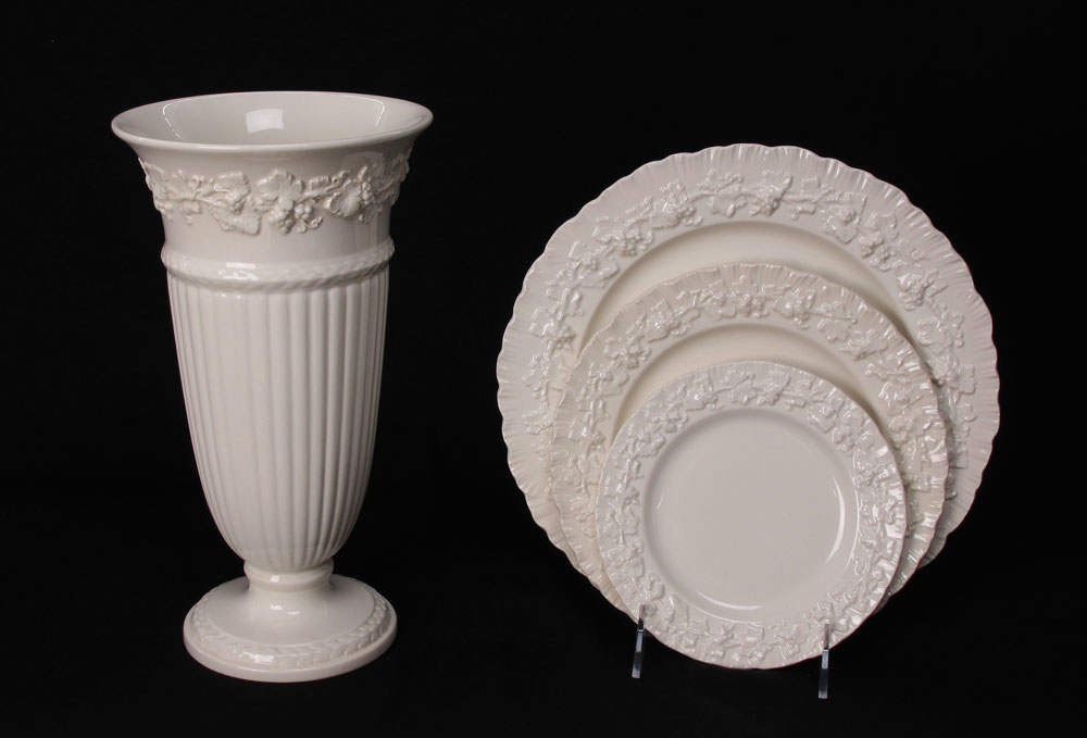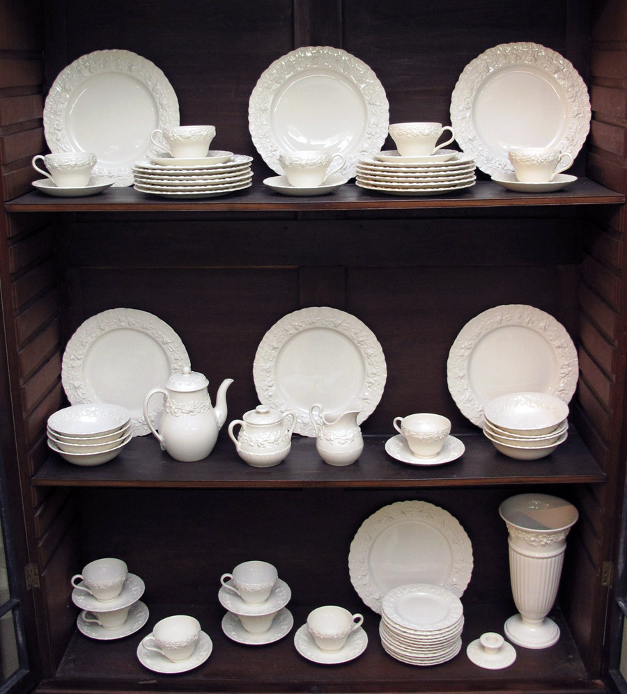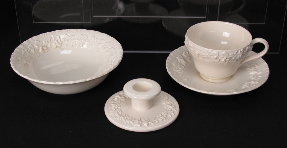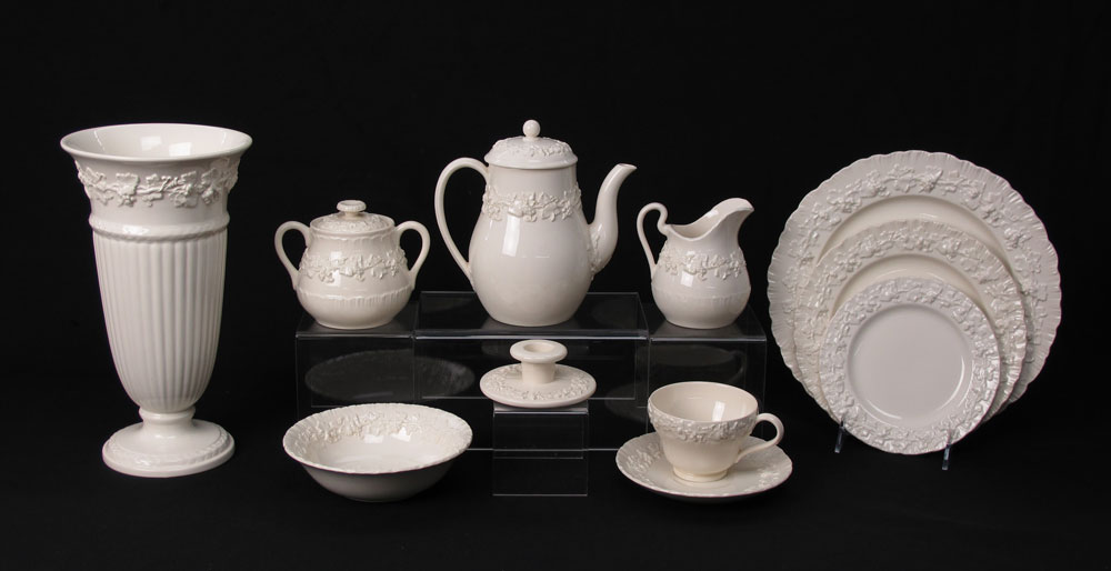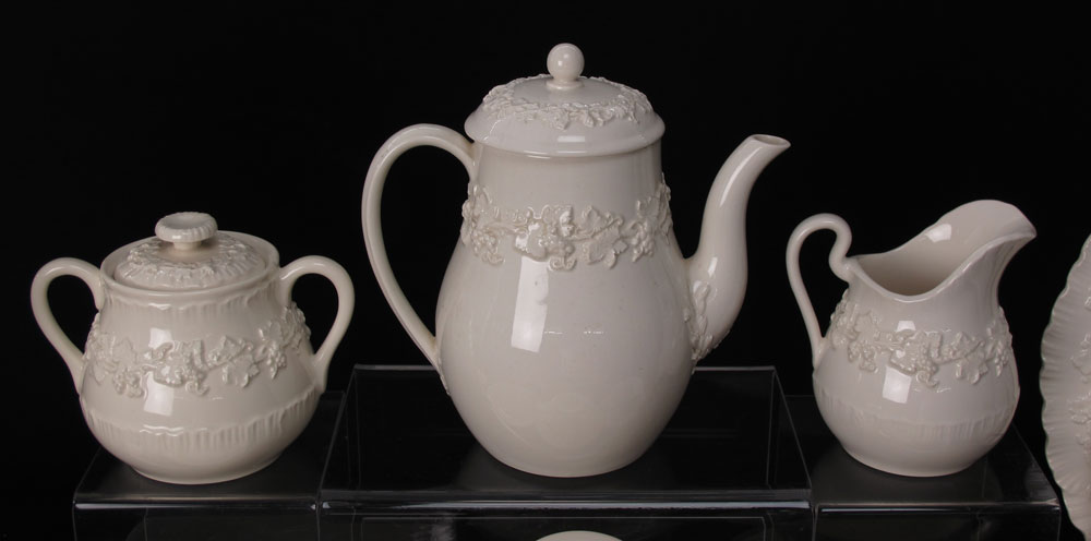 WEDGEWOOD CREAM QUEENSWARE: 67 pieces of the embossed grape vine china to include 7 dinner plates, (10 3/4''), 12 salad plates, 12 bread plates, 8 cereal bowls, 11 cups and 12 saucers. Also the 11'' vase, single short candle holder, creamer, sugar, and the 7'' tea or coffee pot.