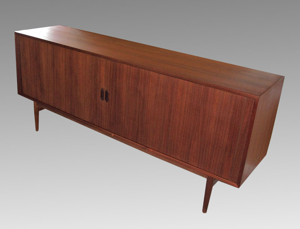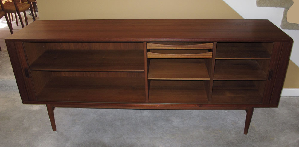 DANISH MODERN TAMBOUR TEAK CREDENZA attrib. ARNIE VODDER: Interior with pull out trays and shelves. Approx. 31'' tall x 74 1/2''l. x 18 1/2''.