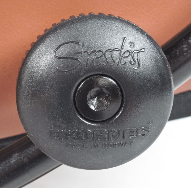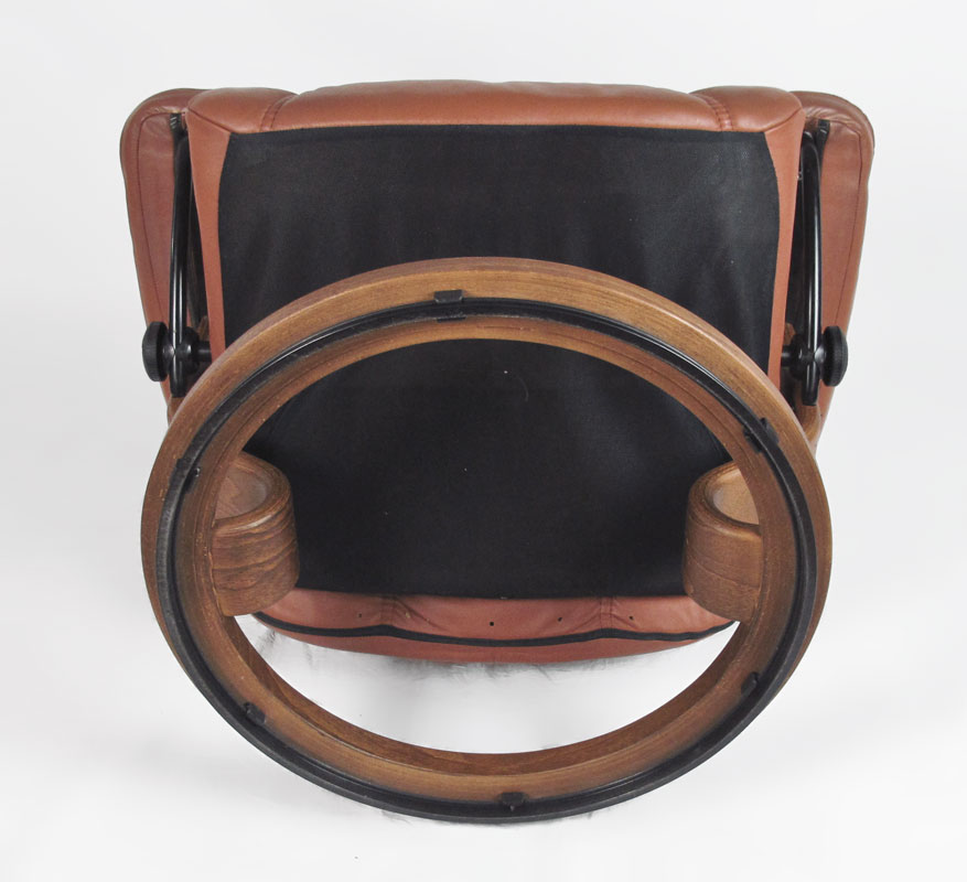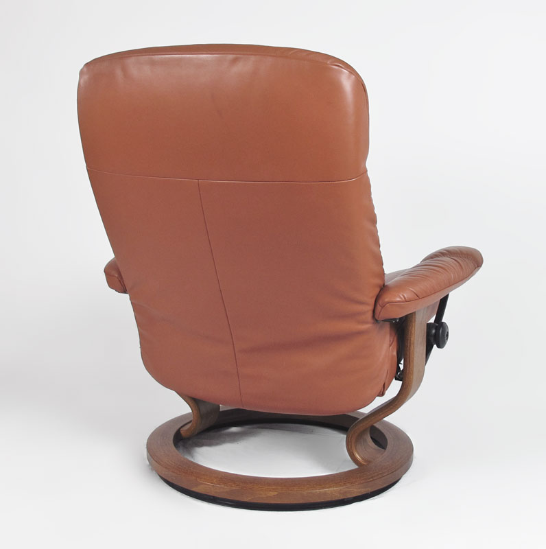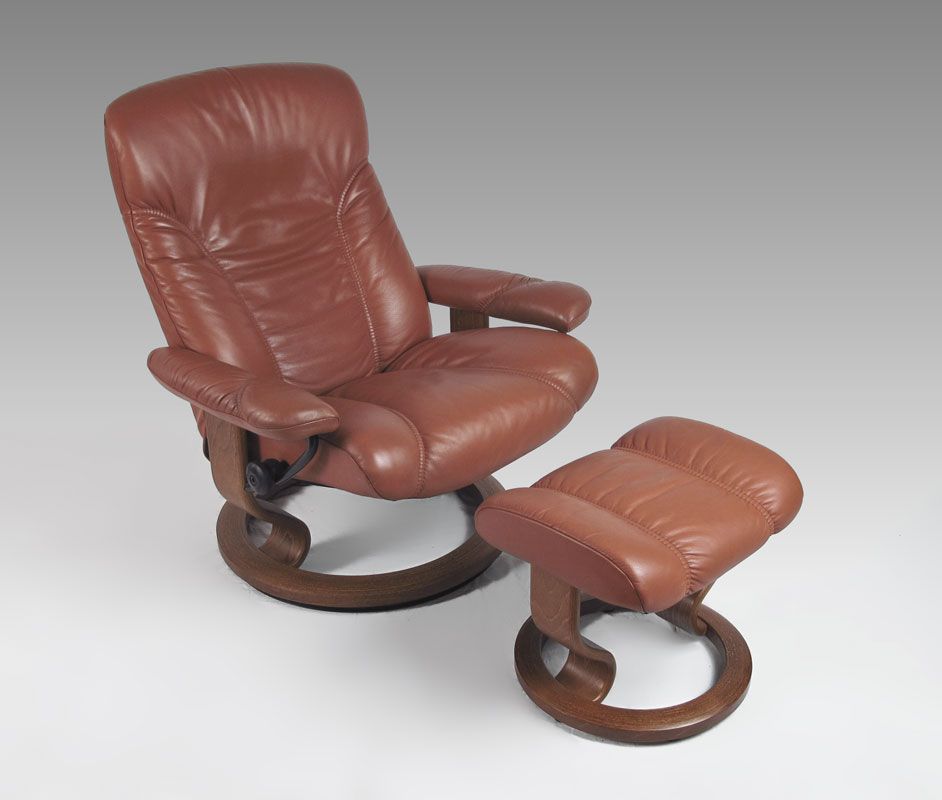 EKORNES STRESSLESS LEATHER LOUNGE CHAIR AND OTTOMAN: Brown leather upholstery, chair 38'' h. x 35'' x 34''. Ottoman 16'' h. x 19'' x 15''.