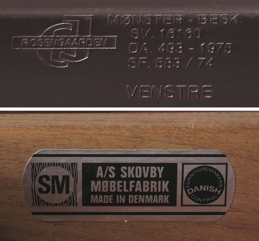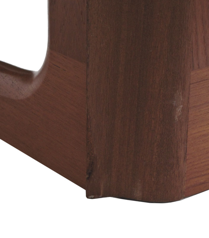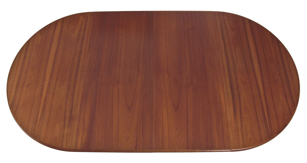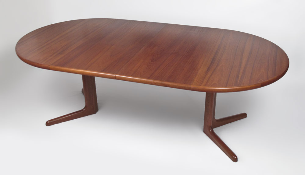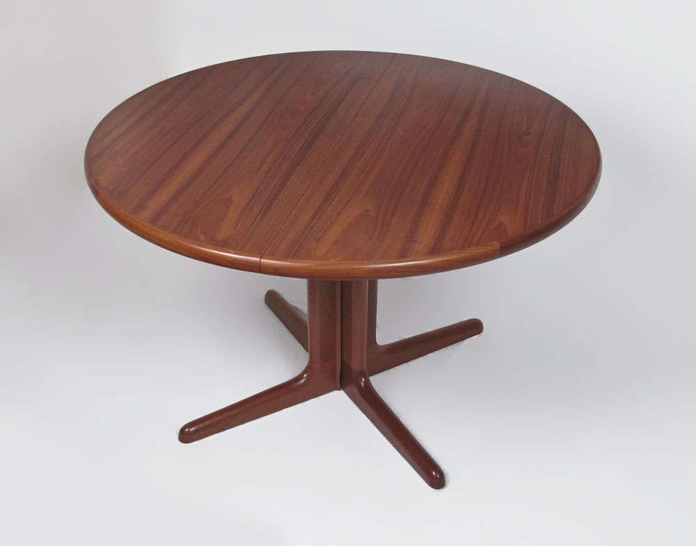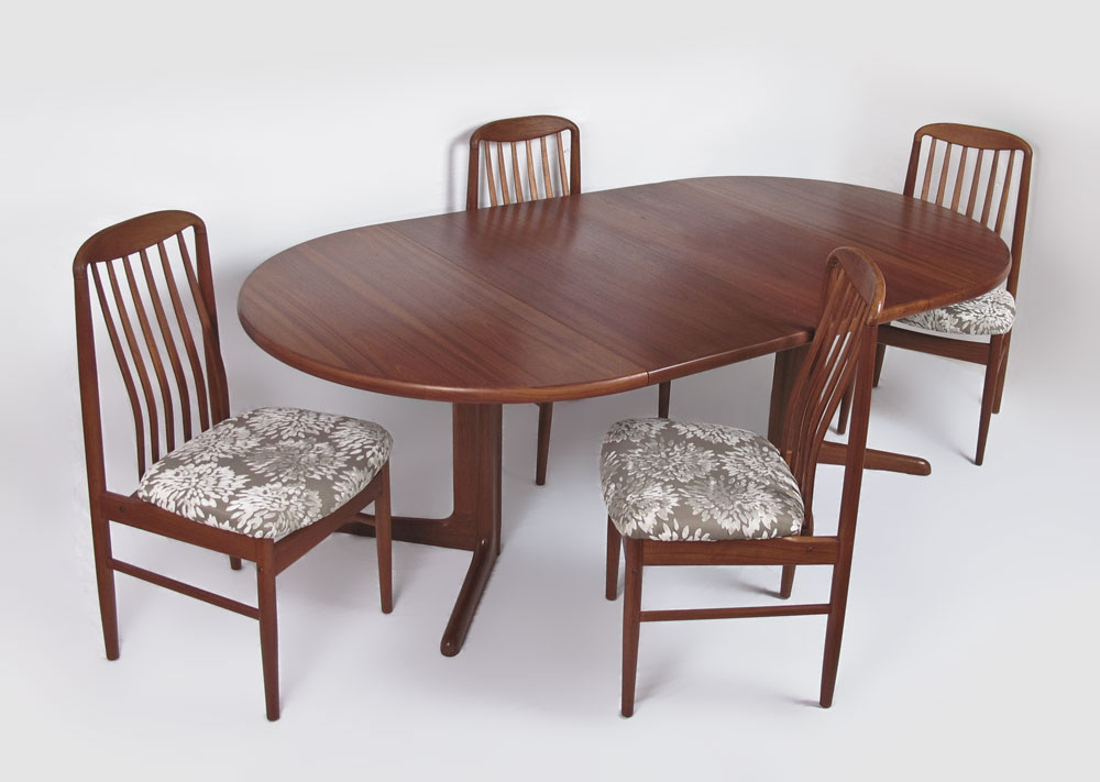 DANISH MODERN TEAK DINING TABLE AND 4 CHAIRS: Scovby and Danish quality control foil label on the table. The four chairs have curved and slated backs. Table 29'' h. x 46 1/2'' dia., 2 leaves 19 3/4'' w. each, chairs 37 1/2'' h. x 18 1/2'' x 21''.
