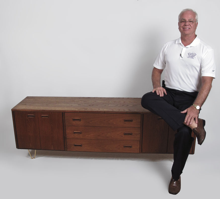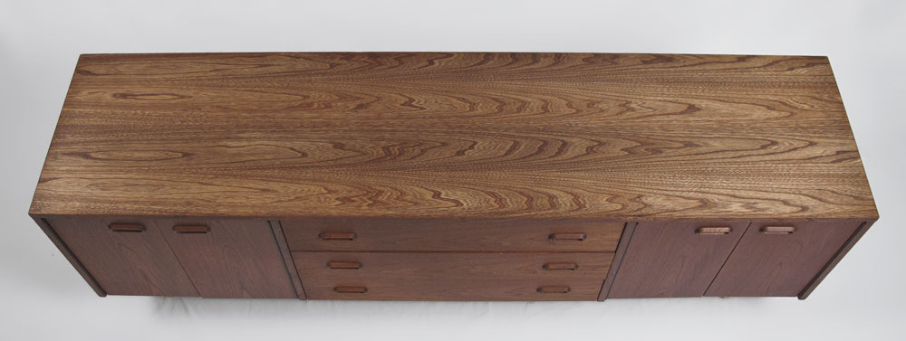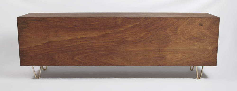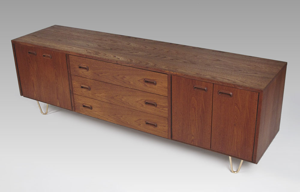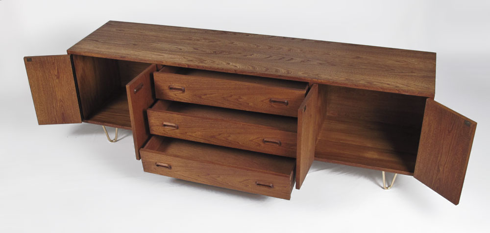 MID CENTURY LOW CREDENZA: Aluminum hair pin legs support the credenza with three central drawers flanked by double doors. Approx. 23 3/4'' tall x 6' long x 18'' deep.