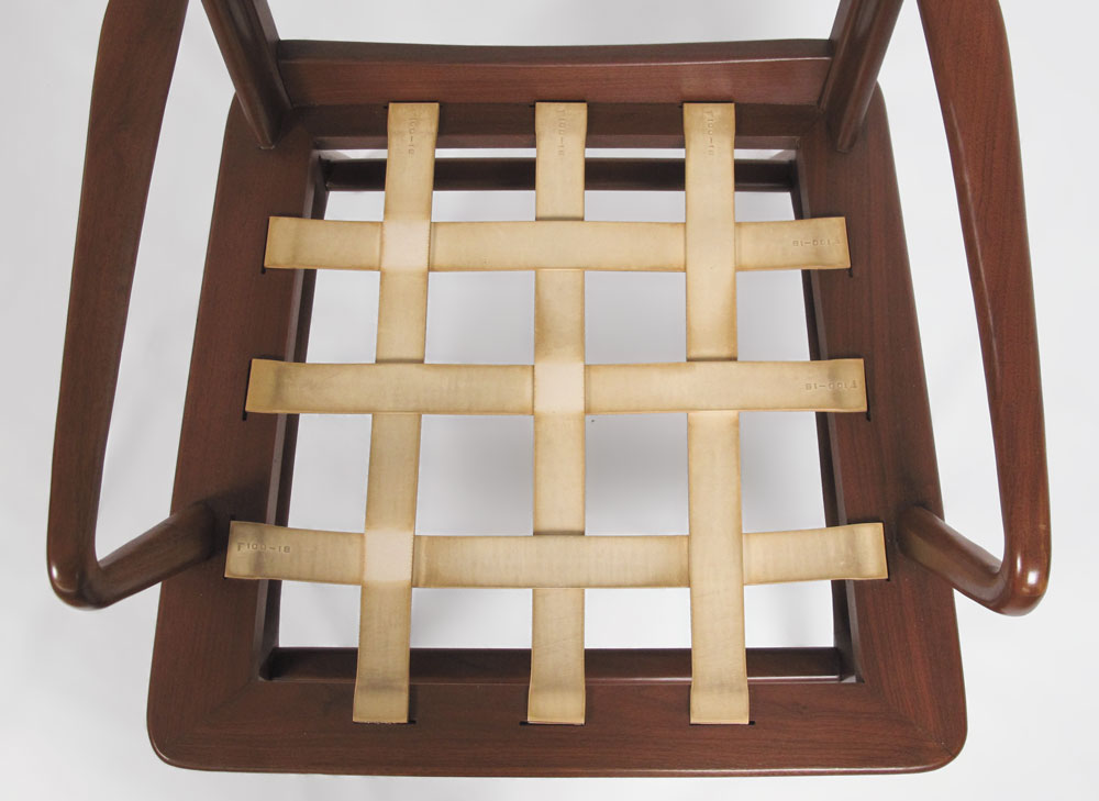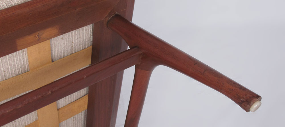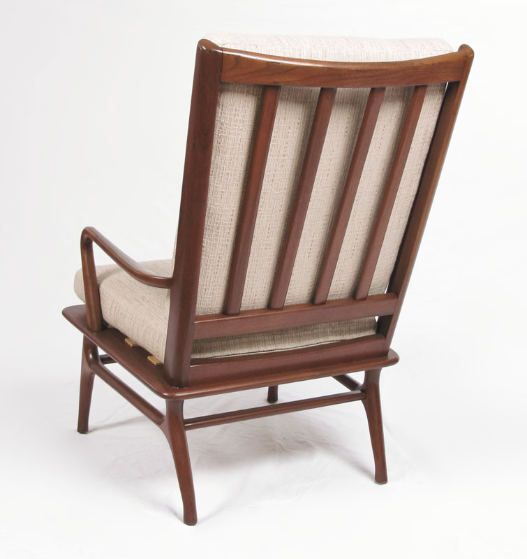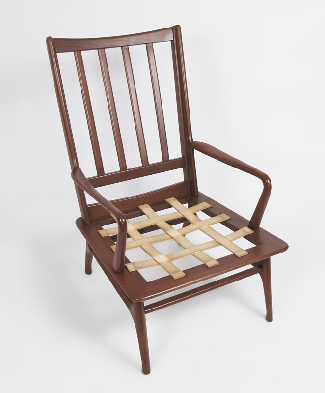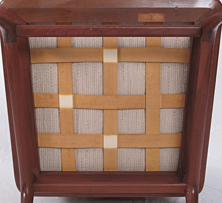 DANISH MODERN OPEN ARM LOUNGE CHAIR: Newly upholstered cushion seat and back. Approx. 38'' x 27'' x 24''.