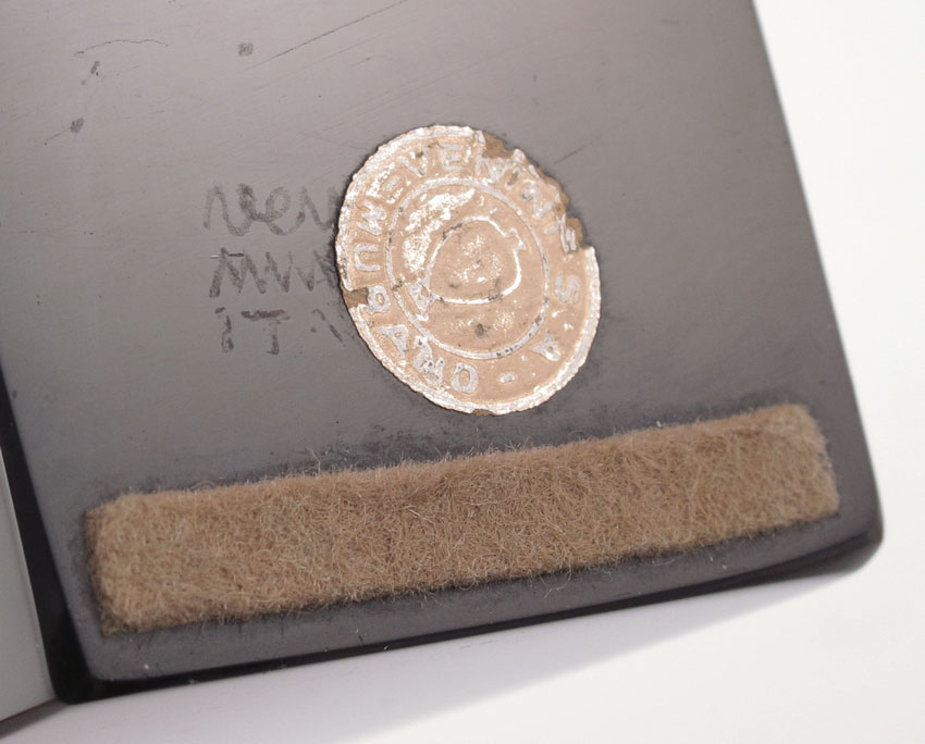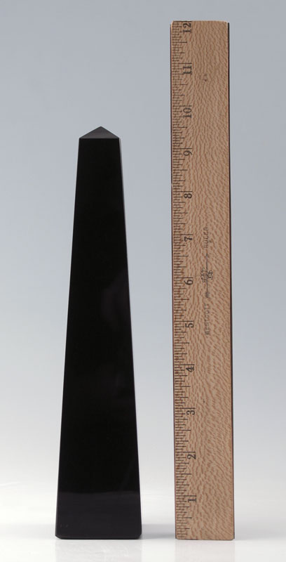 MURANO VENINI BLACK GLASS OBELISK: Inscribed Venini Murano partially visible under foil label. 9 3/4'' tall, the base 2'' square.