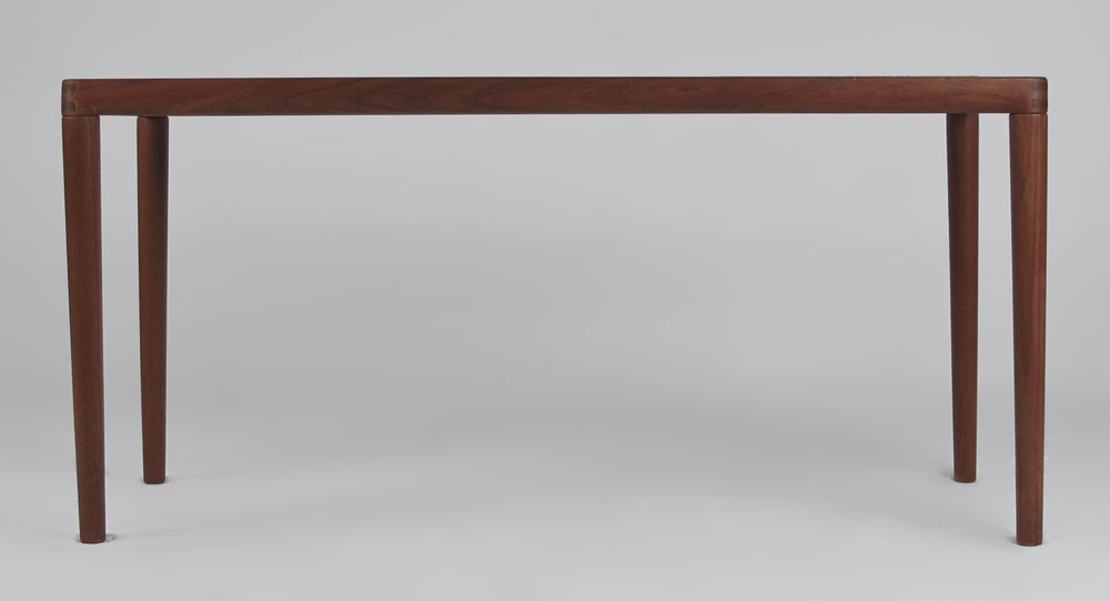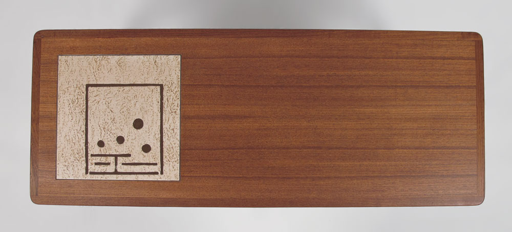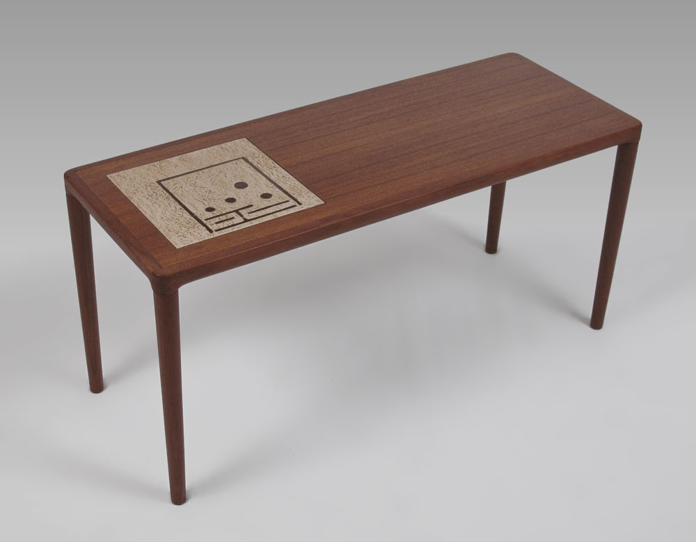 DANISH MODERN TEAK COFFEE TABLE: With off center inlay tile. Stamped underneath K. T. N. 174, 17'' h. x 36 1/4'' x 14''.
