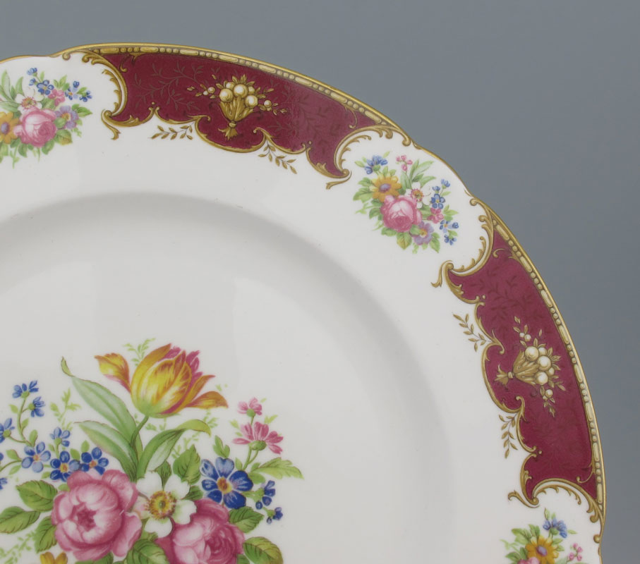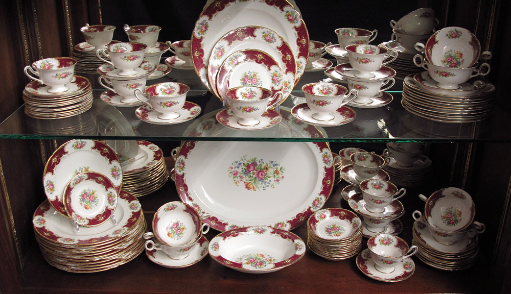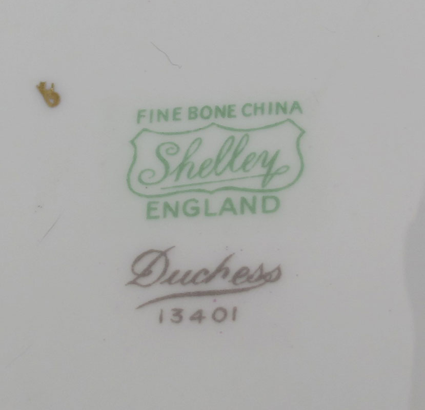 SHELLEY BONE CHINA SERVICE IN THE DUCHESS PATTERN: 93 pieces to include 12 dinner plates, 12 salad plates, 12 bread plates, 12 dessert bowls, 10 cream soups with 11 saucers, 11 tea cups, 11 saucers, open vegetable bowl and the 16 1/2'' platter.