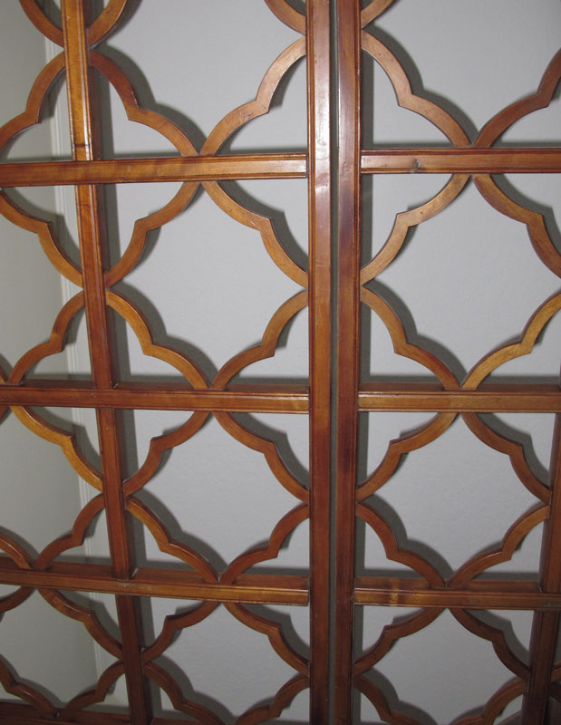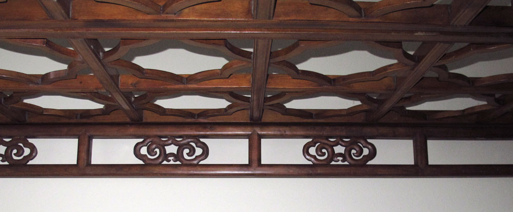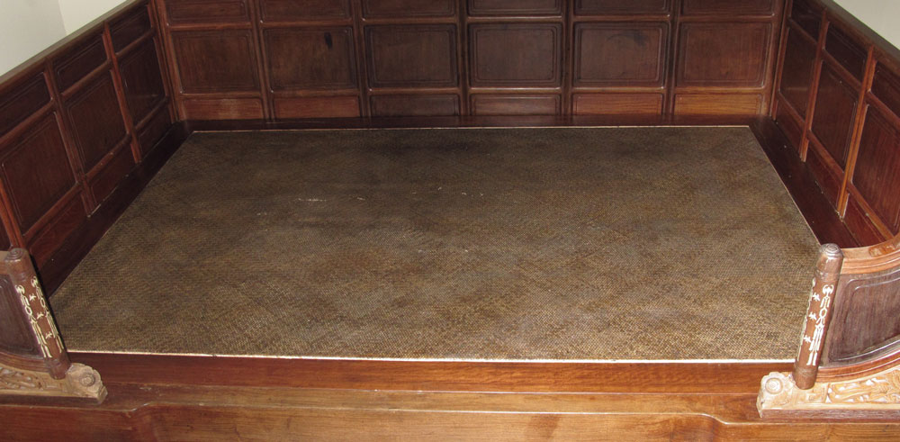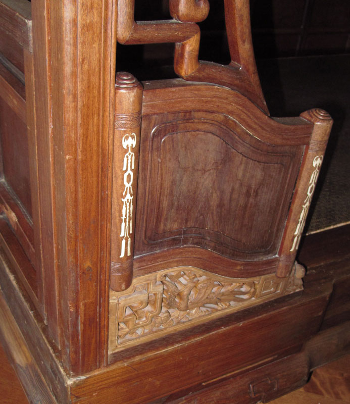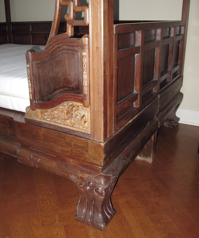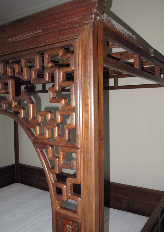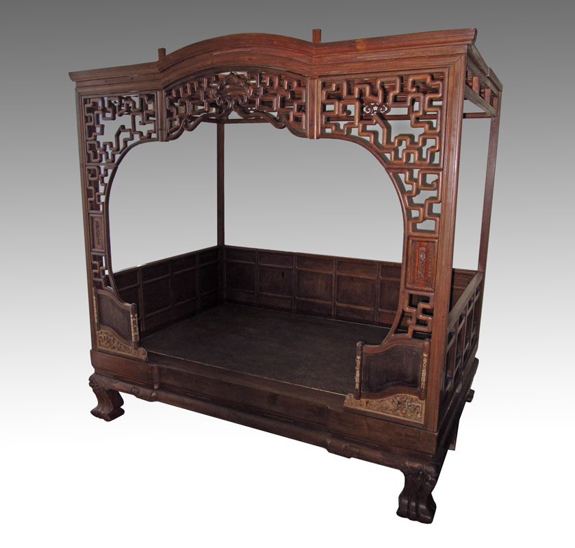 CHINESE CANOPY BED: Posts supporting open fret panel canopy, three paneled ''walls'', carved and inlay details. Often referred to as a wedding or opium bed. Measures 7' tall x 6'9'' x 4'8''.
