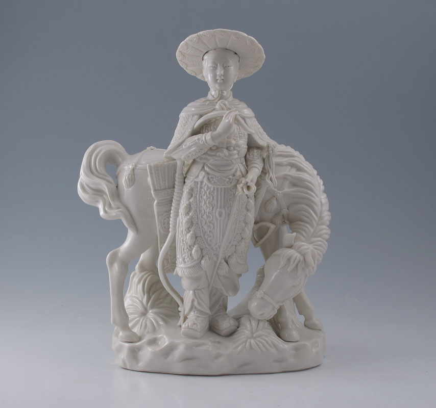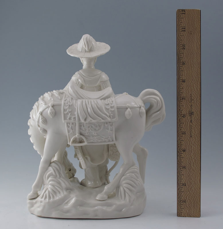 CHINESE BLANC DE CHINE FIGURAL GROUP: Well dressed figure and horse, 9'' tall x 11''.
