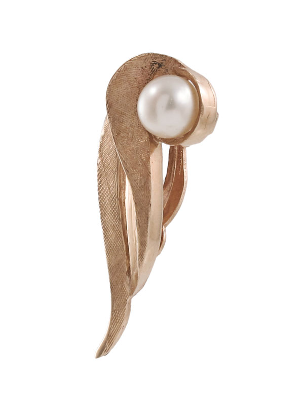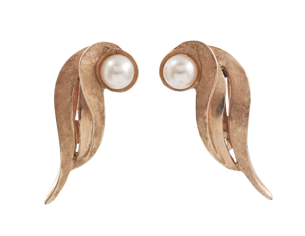 14K MID CENTURY PEARL EARRINGS: 14K yellow gold earrings with two 6.00 mm cultured pearls. White in color with high luster. The pearls are peg set. Hinged clip closures. Weight: 11.0 grams.