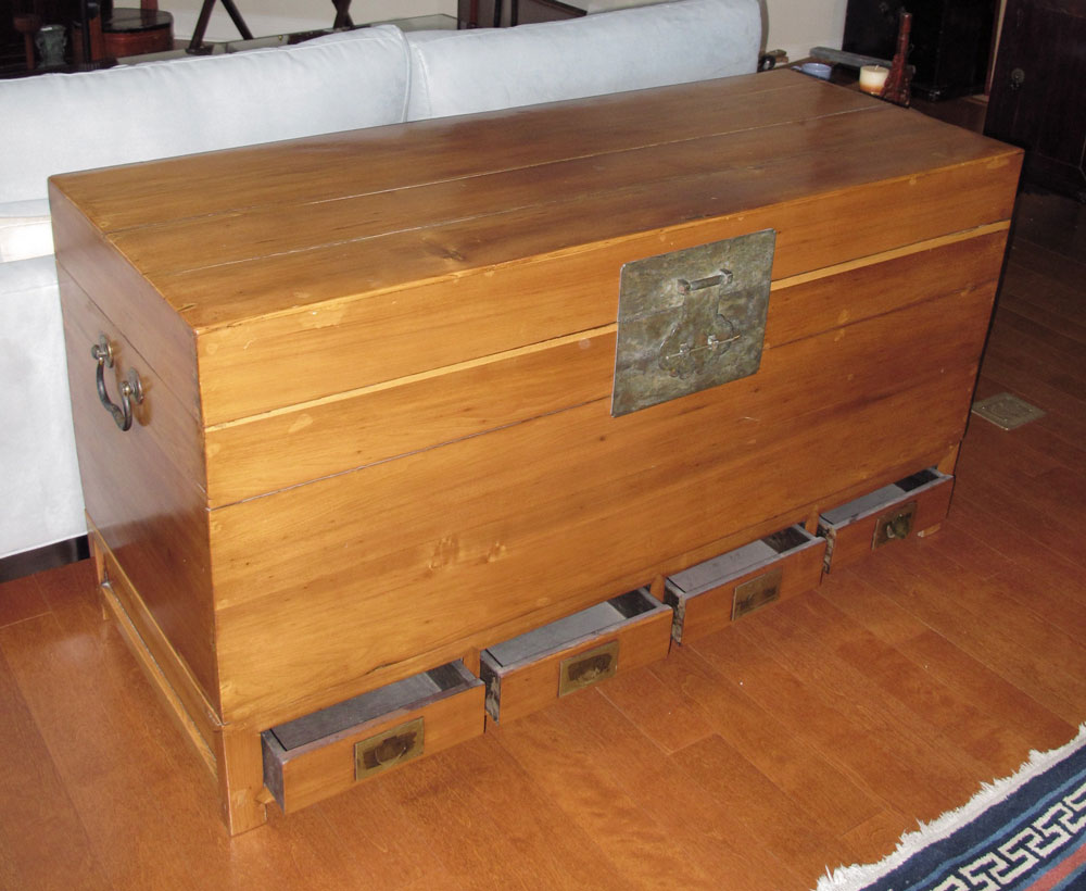 LARGE ORIENTAL STORAGE TRUNK: Trunk on separate base, top with hinged lid, iron hardware and handles. Sits on separate 4 drawer base. Overall 32'' h. x 60 1/2'' x 25''.