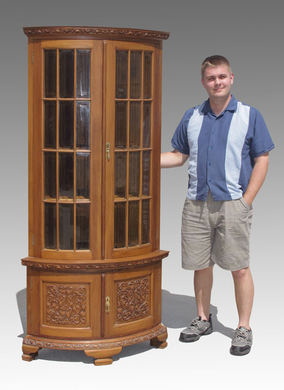 CARVED CORNER CABINET: Paneled glass doors, carved trim and carved panels on lower doors. Key in office. Key in office. 75 1/2'' x 35'' x 24''.