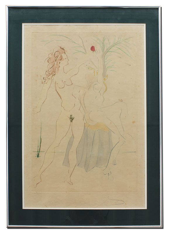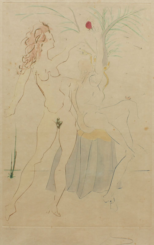 DALI, Salvador, (Spanish, 1904-1989): Adam & Eve, From Our Historical Heritage Suite, Colored Etching With Gold Leaf, sight size 25 1/2'' x 18'', pencil signed lower right, numbered SA 31/300, metal frame, 31'' x 23''.