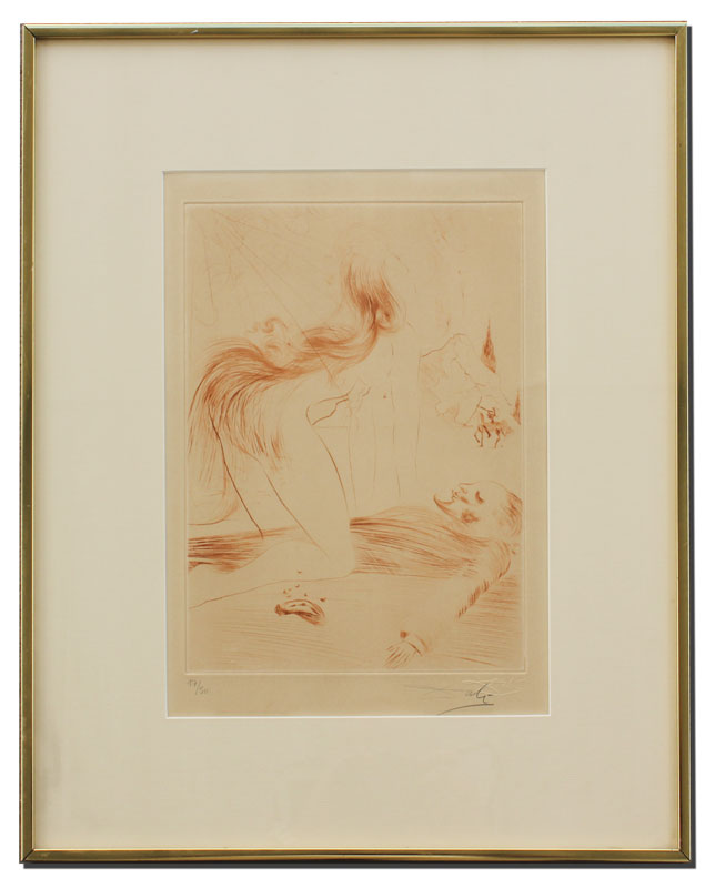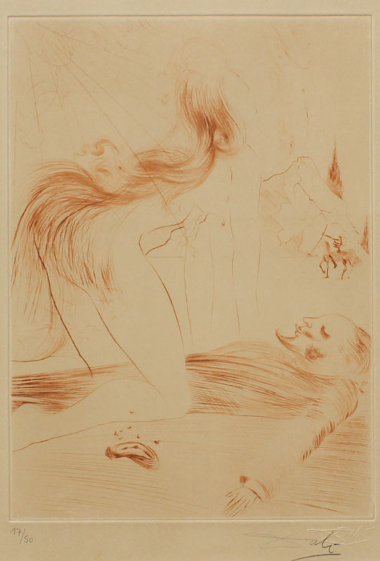 DALI, Salvador, (Spanish, 1904-1989): ''Kneeling Woman'' from ''La Venus Aux Fourrures'' Sanguine Etching, sight size 14 1/4'' x 10 1/4'', pencil signed lower right, numbered lower left 17/50, Dali blind stamp also visible lower right, encased in metal frame, 22 1/4'' x 18 1/4''.