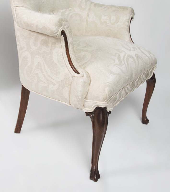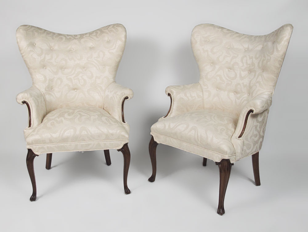 PAIR BUTTERFLY WING BACK CHAIRS: White upholstered chairs with carved front legs ending in paw feet. 44 1/2'' h. x 37'' x 28 1/2''.