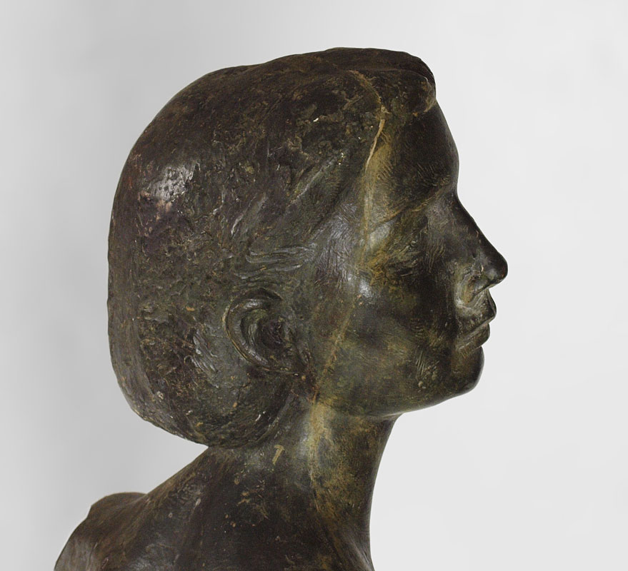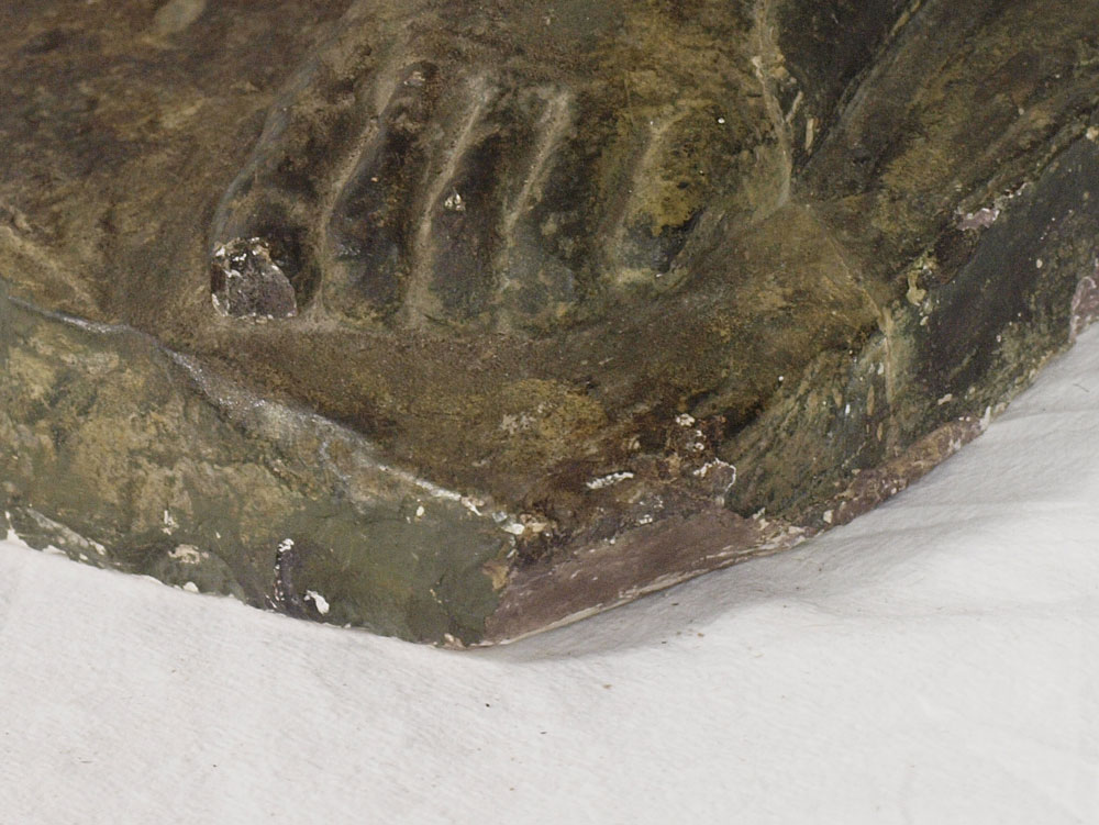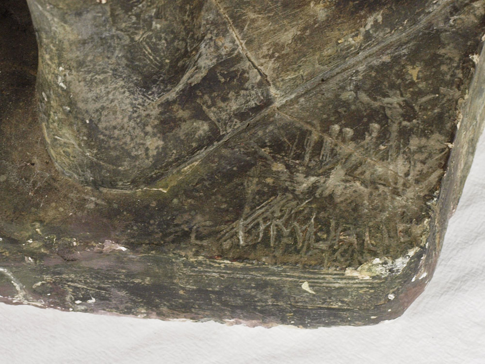 CONDITION: Several areas of wear and missing patina, small repair to base in lower left front.