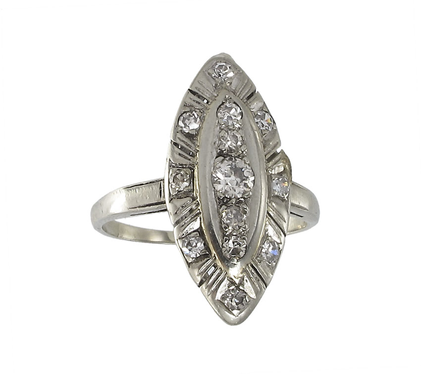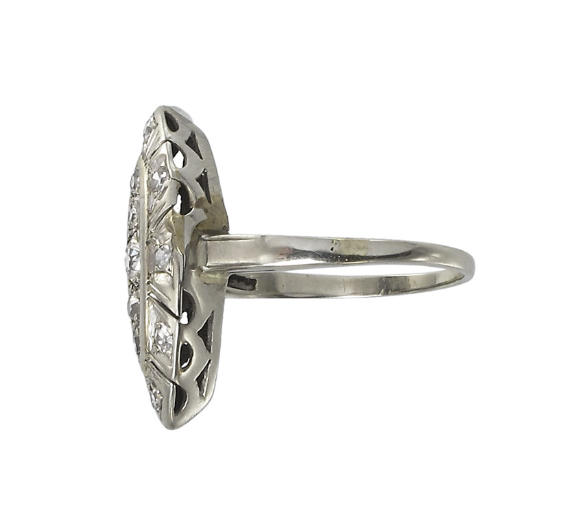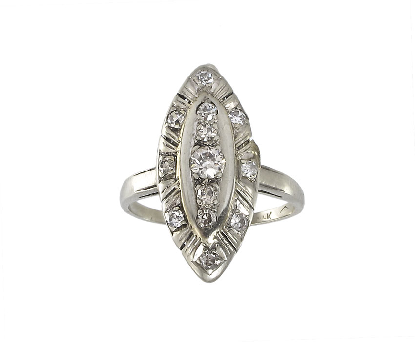 14K GOLD ART DECO DIAMOND RING: 14K white gold ring contains one old European round cut diamond and 12 round single cut diamonds. Weight: .60 Ct. Approx. Rated VS-SI in clarity and H-I in color. The diamonds are prong set. Weight: 3.3 grams. Size: 7.5