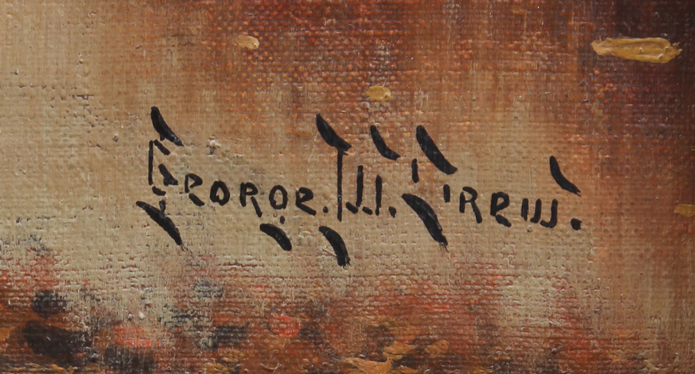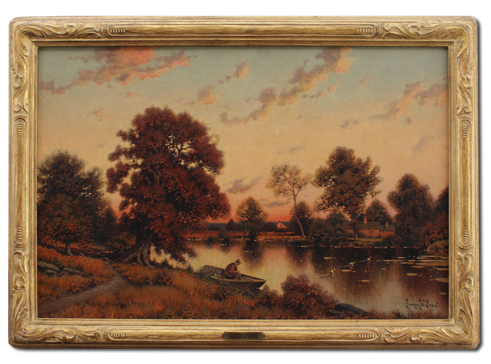 DREW, George W., (American, 1875-1968): ''Autumn Sunset'', depicts fisherman in a serene country river landscape with homes in the distance, Oil/Canvas, 20'' x 30'', signed lower right, encased in a carved, gilded frame, 24'' x 34''.