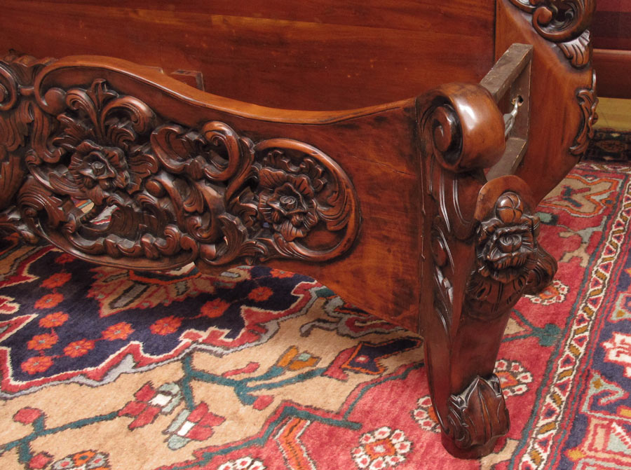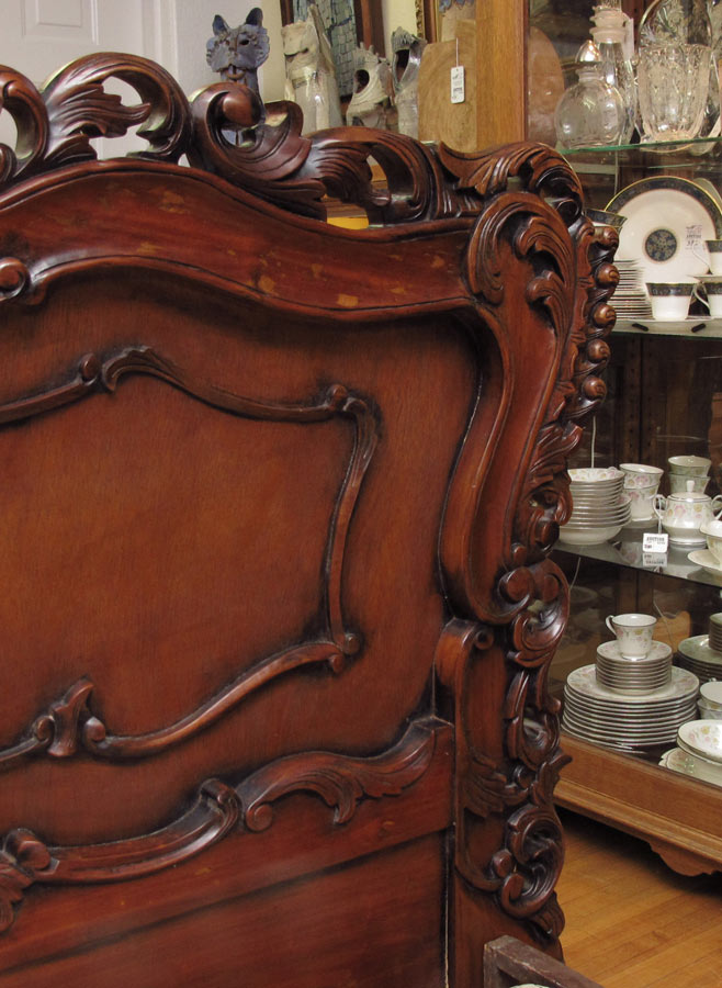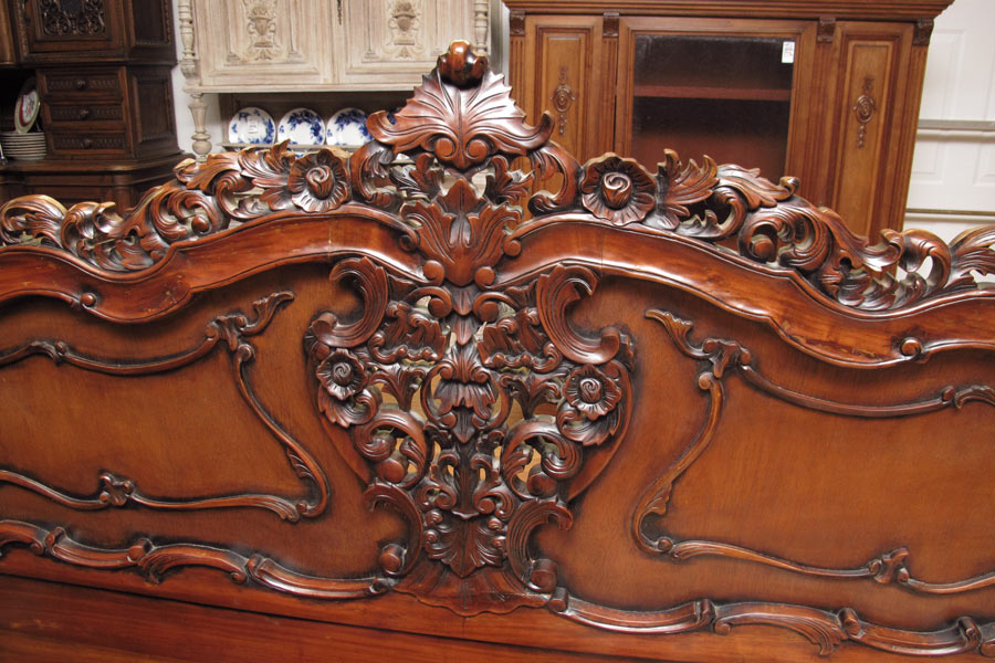 ORNATELY CARVED MAHOGANY BED: Ornately carved headboard, footboard, rails king size in the rococo style. Headboard 57 1/2'' h. x 92'' x 1 1/2'', foot board 23'' h. x 90 1/2'' x 6'', rails 78 3/4'' long.
