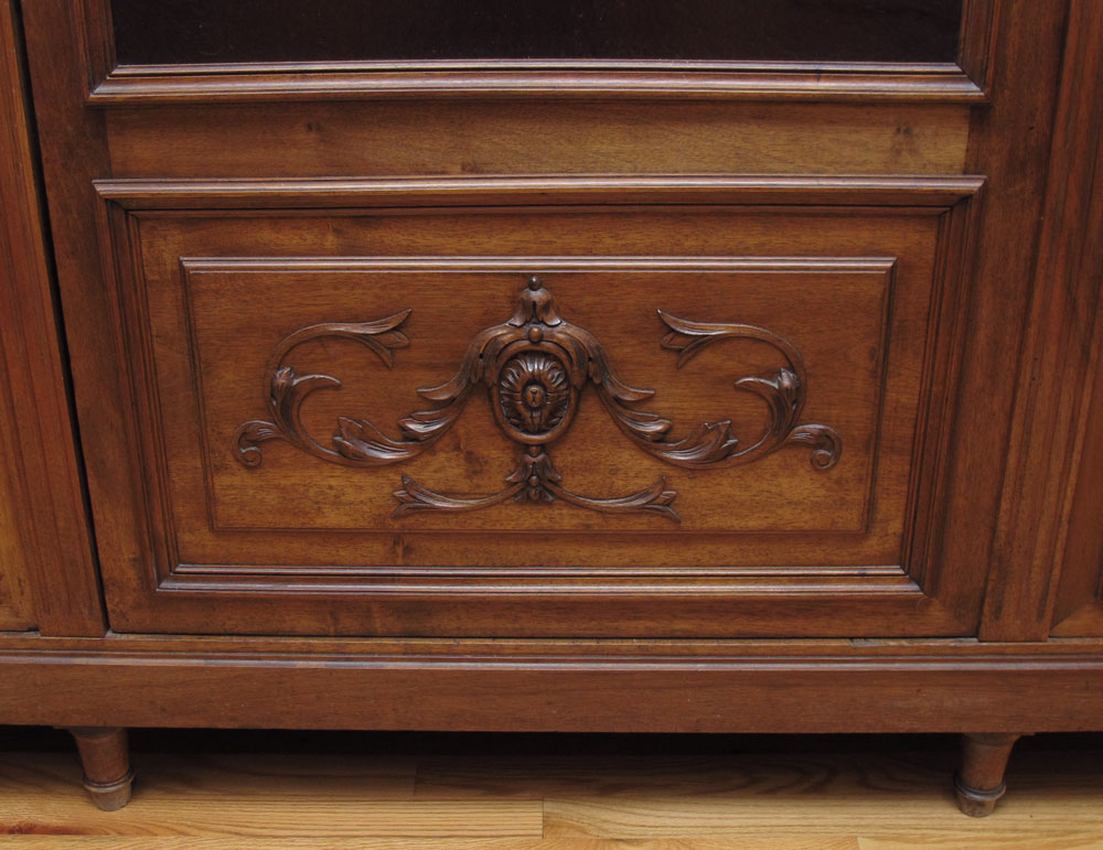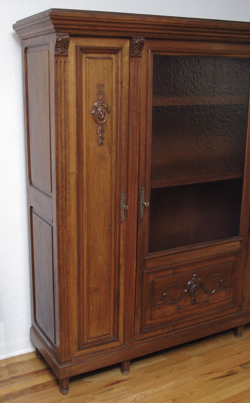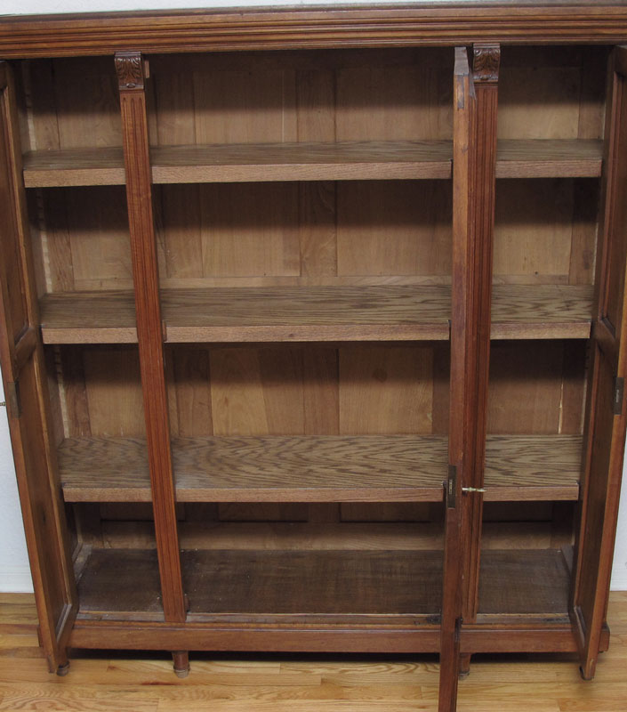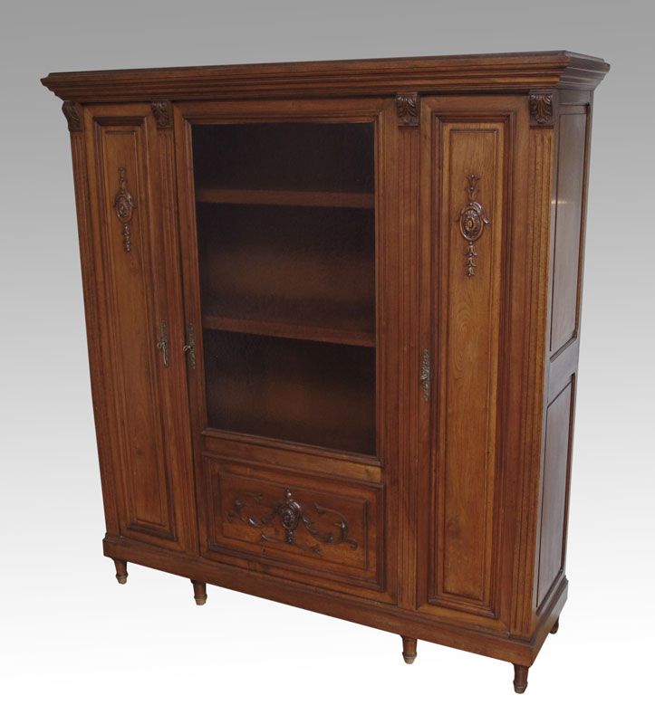LATE VICTORIAN CUPBOARD: French style walnut three door cupboard, the center with frosted glass. 89 3/4'' h. x 62 1/2'' x 18''.