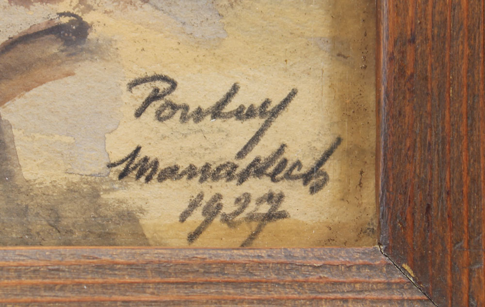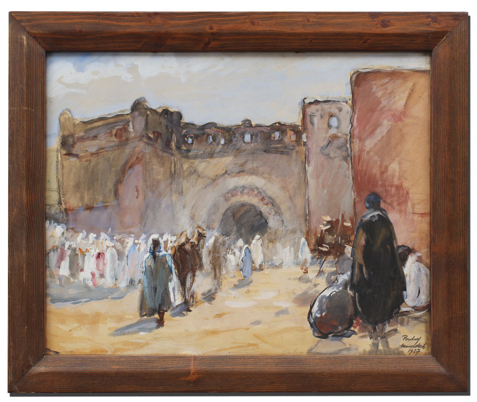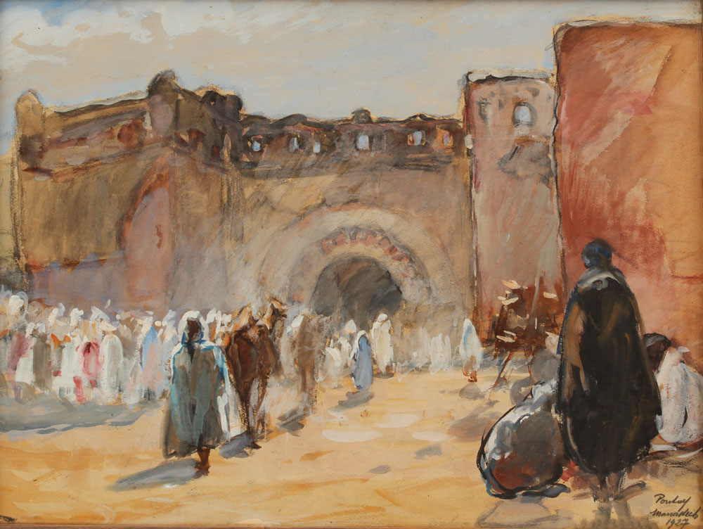 PONTOY, Henri Jean, (French, 1888-1968): ''Marrakech'', Orientalist street scene with figures, Watercolor and Gouache, 16'' x 20 1/2'', signed lower right, tilted and dated 1927, wooden frame, 19 1/2'' x 24 1/2''.