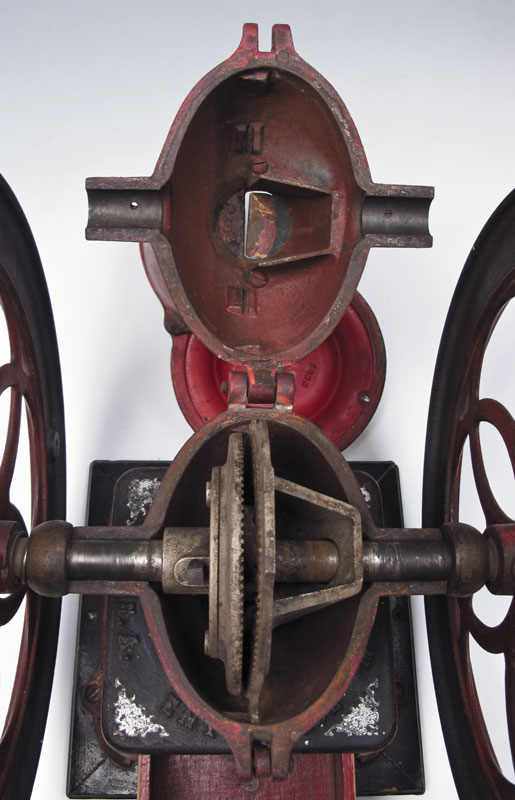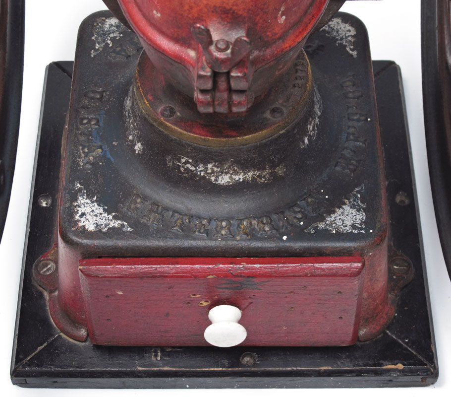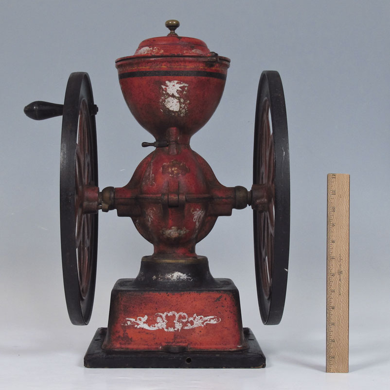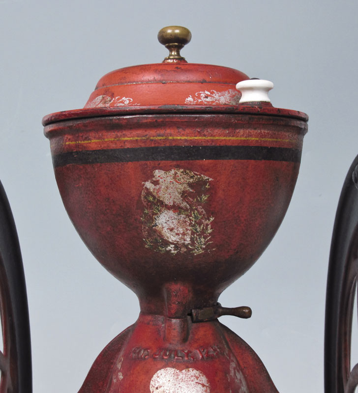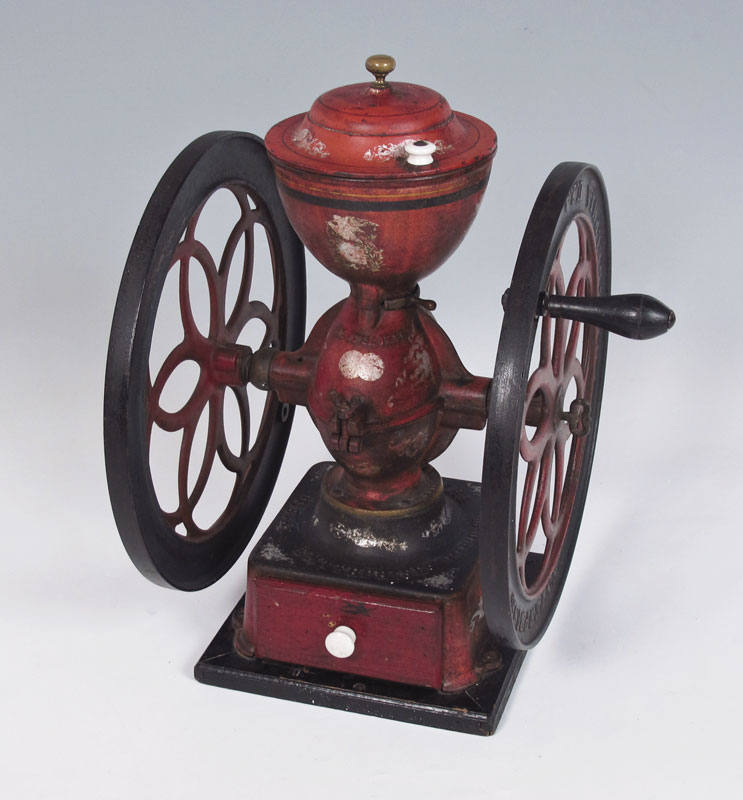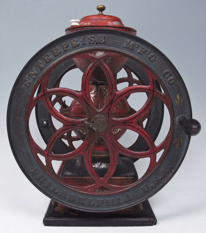 ENTERPRISE CAST IRON COFFEE GRINDER #7: Enterprise #7 cast iron coffee grinder with original decals, porcelain handles on lid and drawer. 17'' wheels, one missing handle. 22 1/4'' h. x 17 3/4'' x 17''.