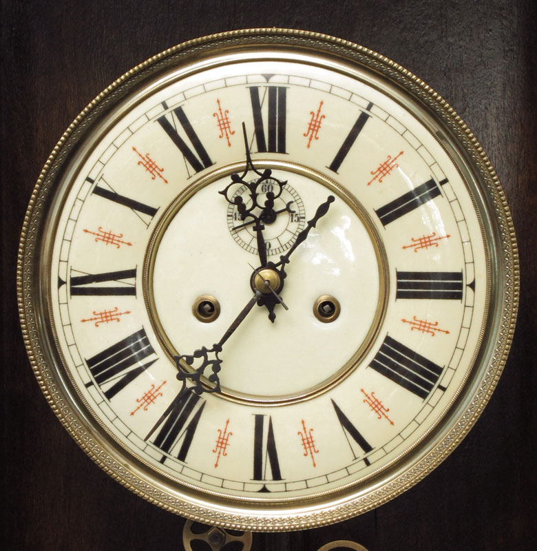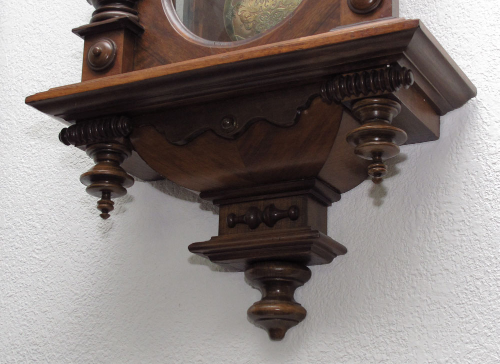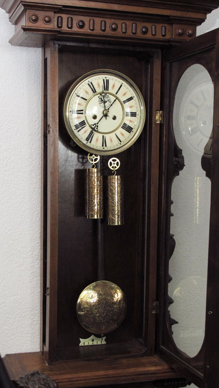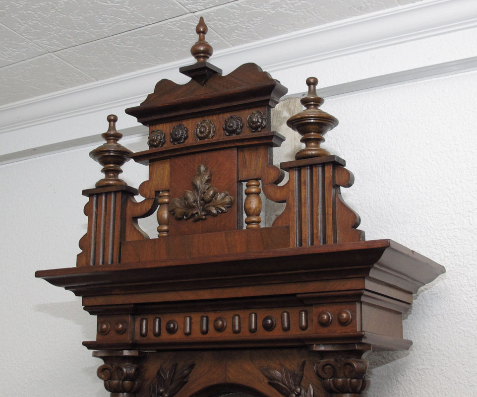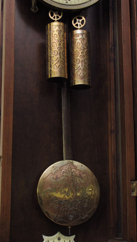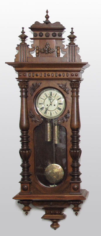 A GRAND MULLER DUAL WEIGHT VIENNA REGULATOR CLOCK: Large carved crest featuring urn finials, applied floral and oak leaf decoration. Walnut case with key hole front glass and caved half columns. Porcelain face with Roman numerals, dual weight movement with embossed weights and pendulum. Movement marked with Muller rose. Measures 58'' h. x 21 1/2'' x 9 1/4''. Crank in office.