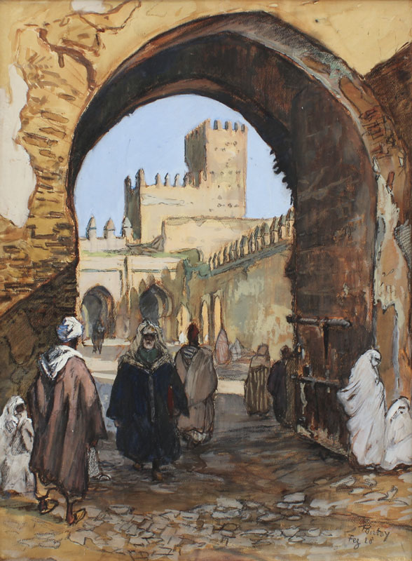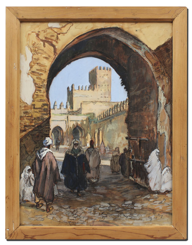 PONTOY, Henri Jean, (French, 1888-1968): ''Fez'', Orientalist street scene with figures, Chalk, Gouache, Pastel and Watercolor, sight size 24'' x 18 1/4'', signed lower right, titled and dated '28, wooden frame, 27'' x 21 3/4''.