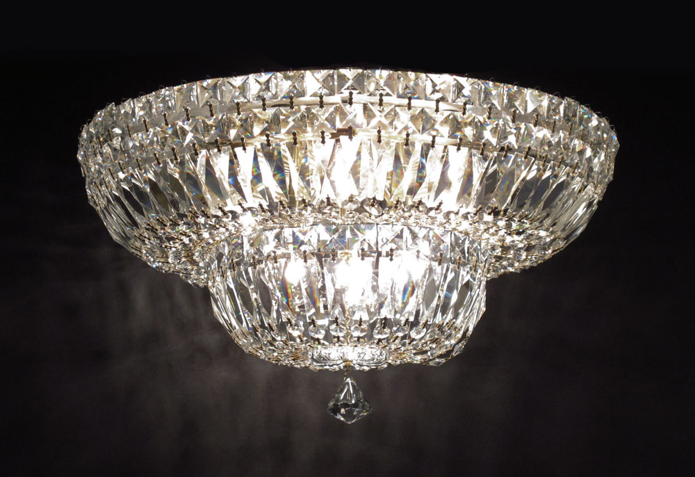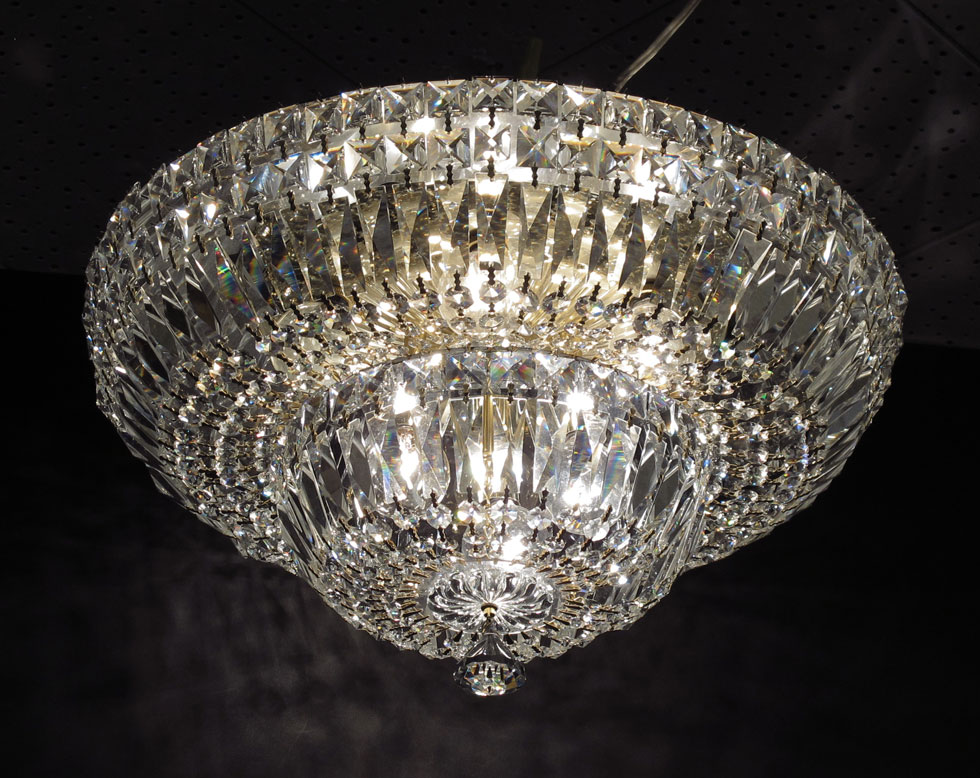SCHONBEK PETIT CRYSTAL DELUXE CEILING BASKET CHANDELIER: Silver metal, extra prisms included. Approx. 10''h. x 18'' dia.