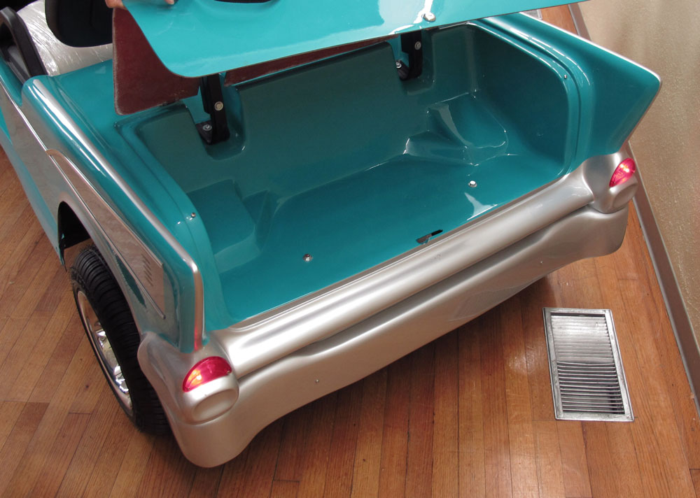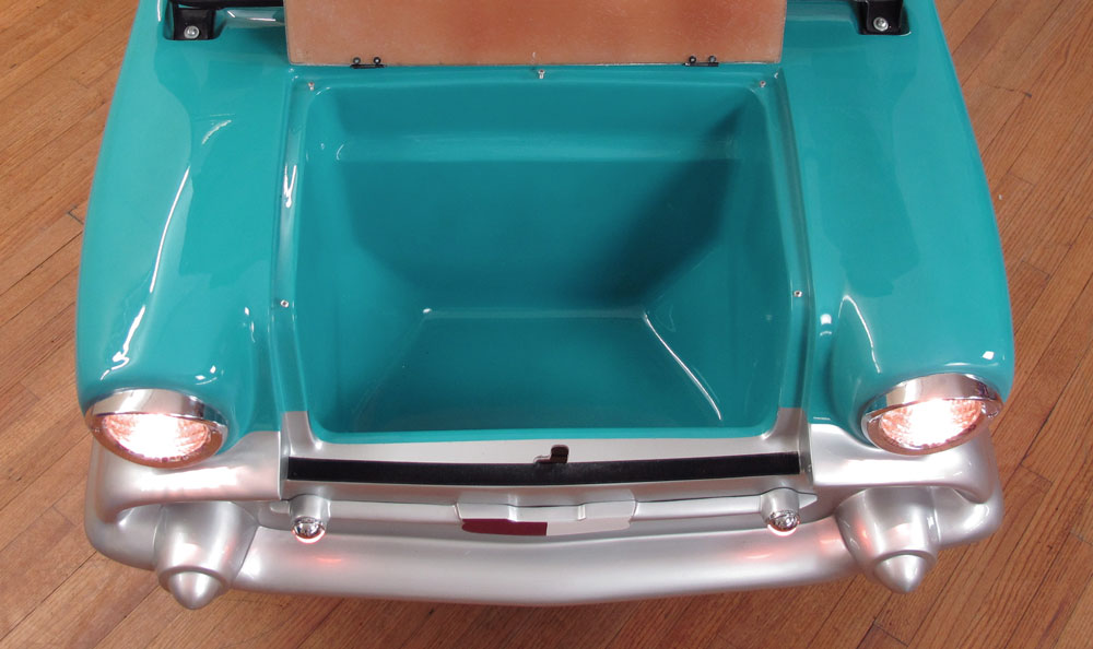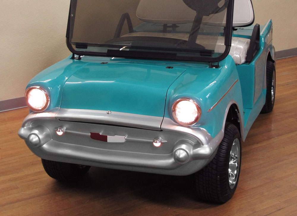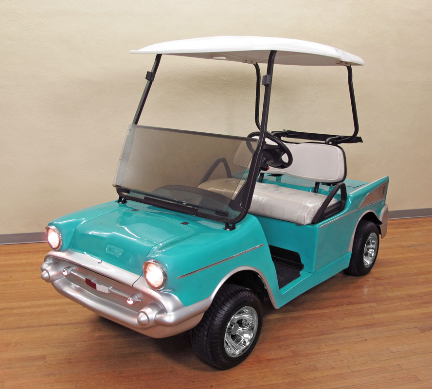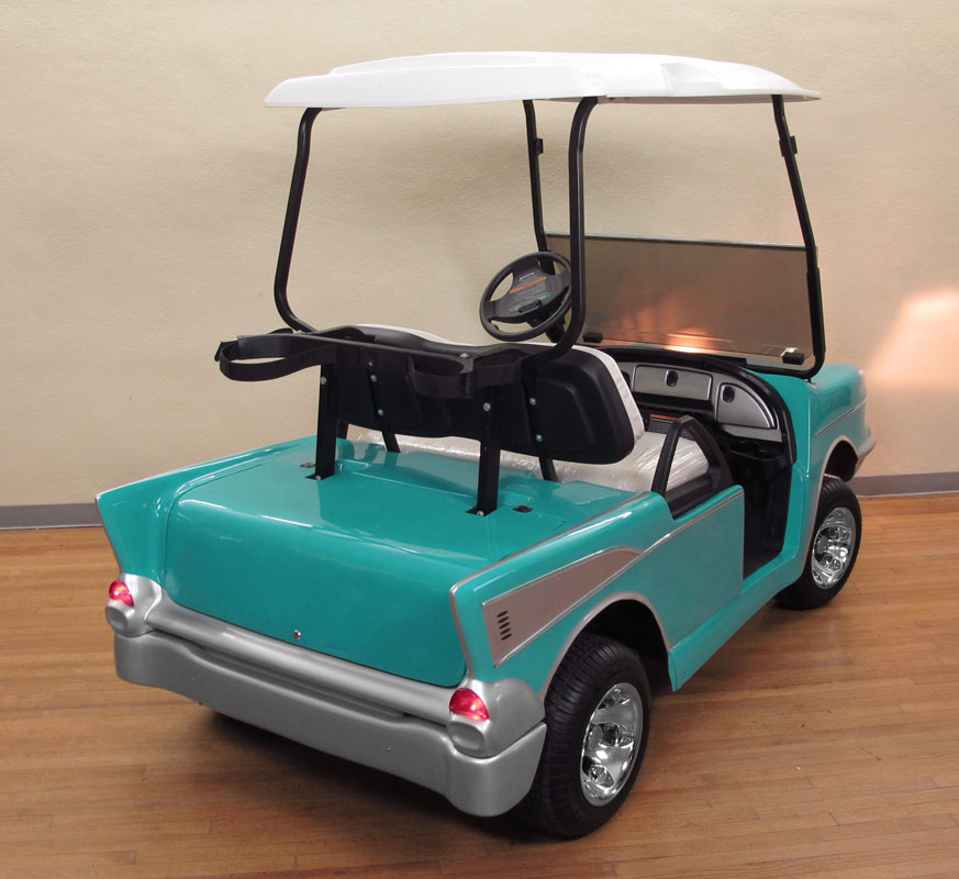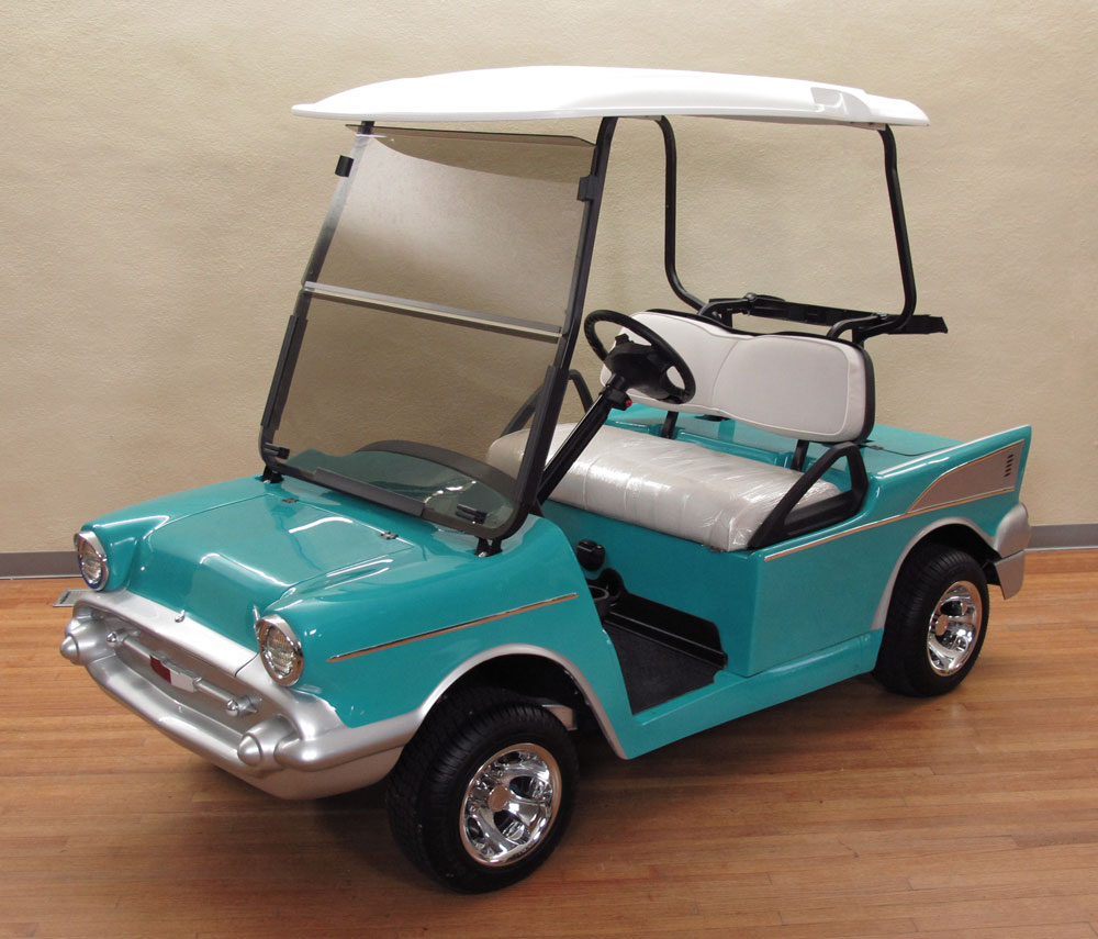 CLUB CAR 1957 CHEVY BEL-AIR GOLF CART: Nice custom golf cart in the shape of a 1957 Chevy Bel-Air by Club Car. Practically new, only driven around the block a couple of times, original plastic still on the seat. Front and rear storage, seats 2 comfortably. Retails for $12,000. Sold with brand new charger as well.