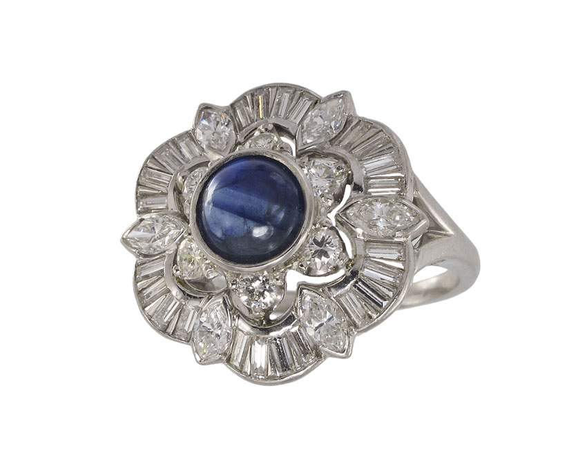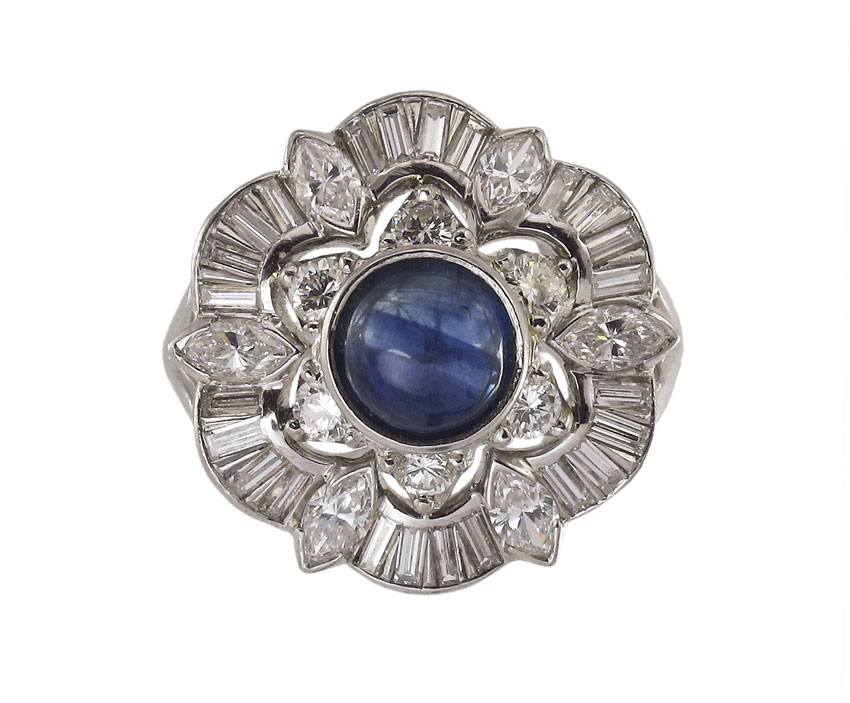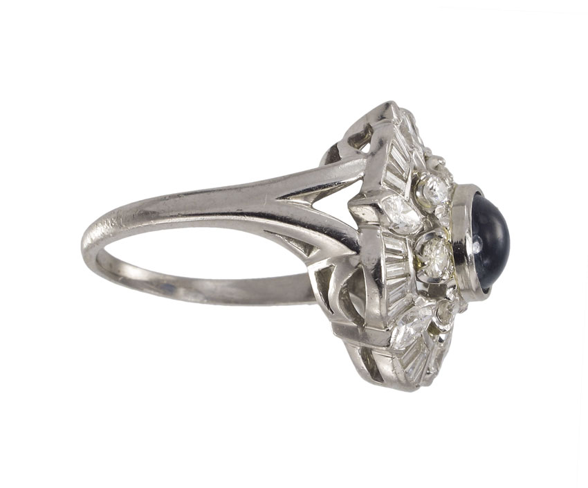 PLATINUM DIAMOND & SAPPHIRE RING: Platinum ring contains one round cabochon cut sapphire. Weight: 1.50 Ct. Approx. The sapphire is rated VS in clarity (Type II), B in Hue, 4 in Tone and 3 in Saturation. 6 marquise cut diamonds, 6 round brilliant cut diamonds and 24 baguette cut diamonds. Weight: 1.25 Ct. Approx. The diamonds average VS in clarity and G-H in color. The sapphire is bezel set. The diamonds are prong and channel set. Weight: 10.2 grams Size: 8.25