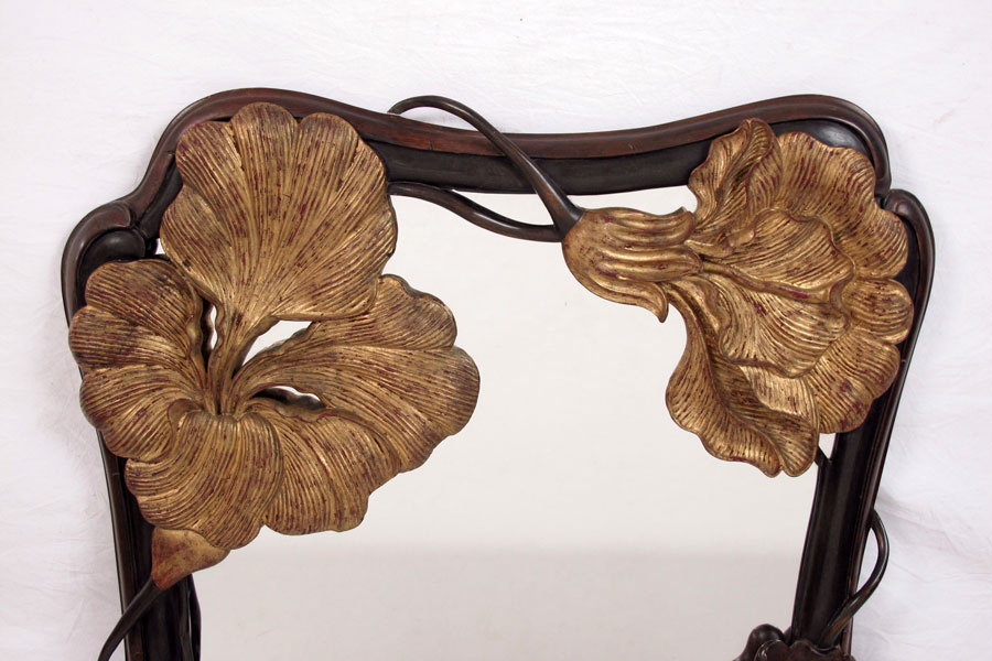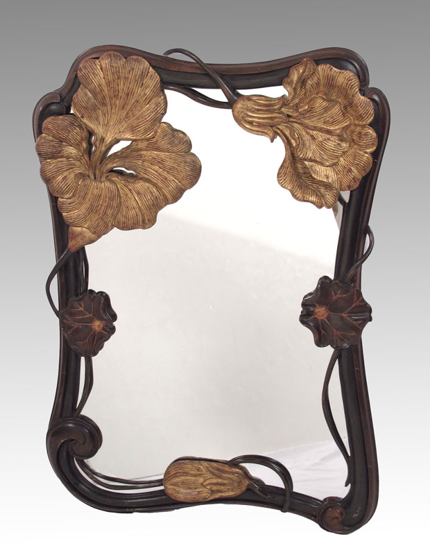 ART NOUVEAU STYLE CARVED WOOD MIRROR: Parcel gilt water lily design, 48'' x 36''.
