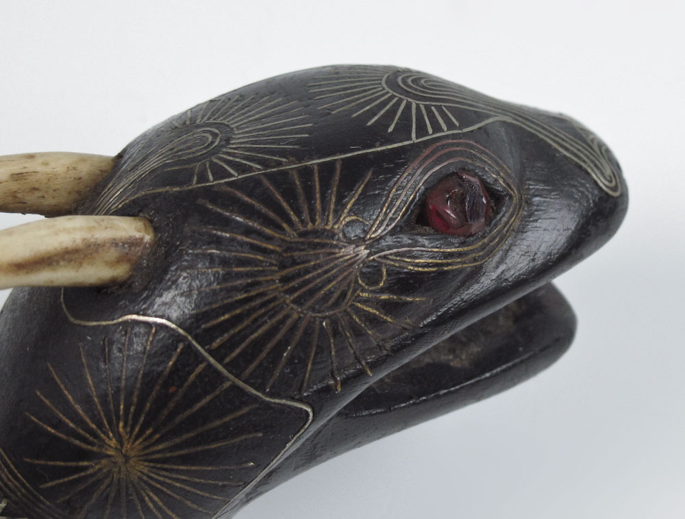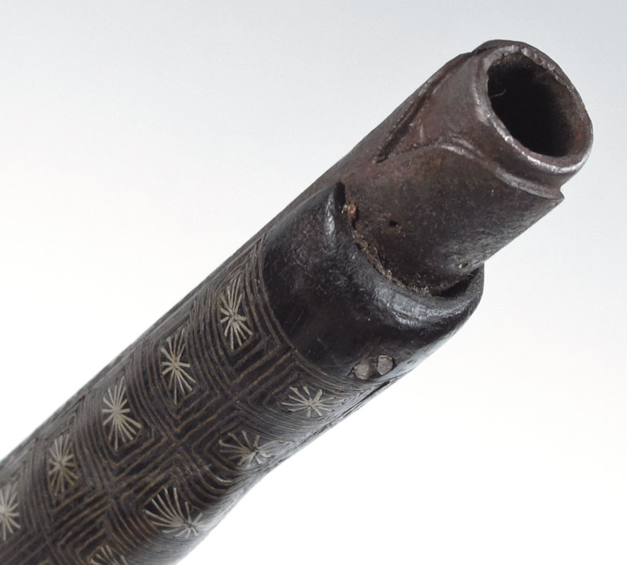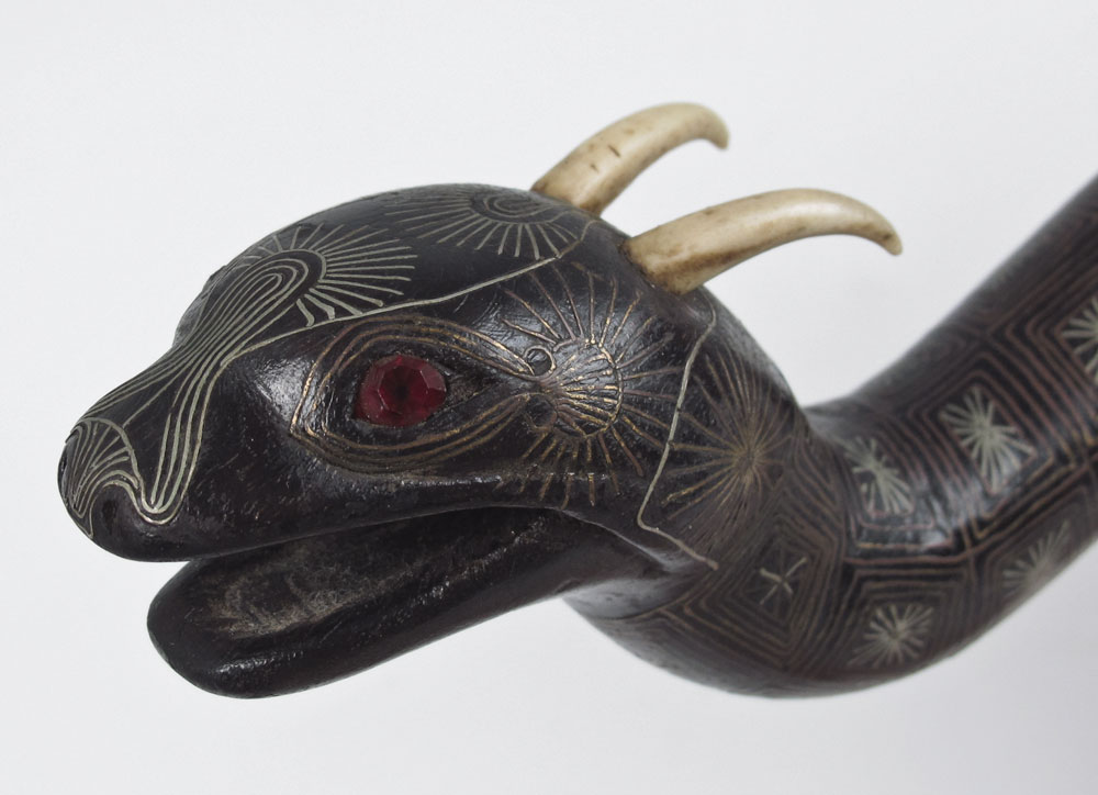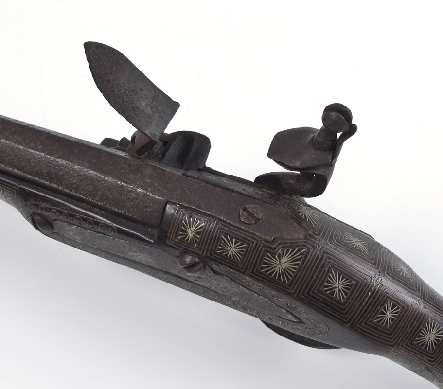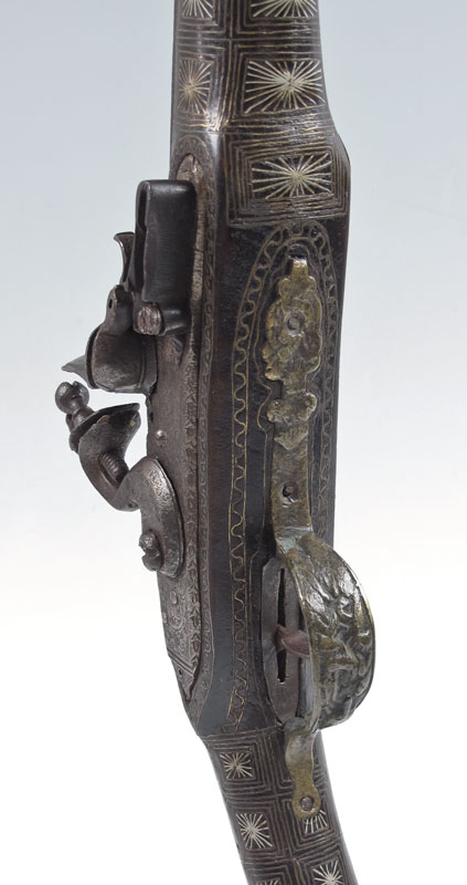 INLAID TURKISH / MIDDLE EASTERN FLINTLOCK PISTOL: 19th century, ornate stock with silver wire inlay in sunburst panels, carved butt in form of serpent with bone horns and red glass eyes. Engraved lock plate, embossed trigger guard. 13 3/4'' barrel with carved ''mouth'' end. A decorative presentation quality firearm, most likely used for ceremonial purposes only. Overall 23 1/2'' l. overall.