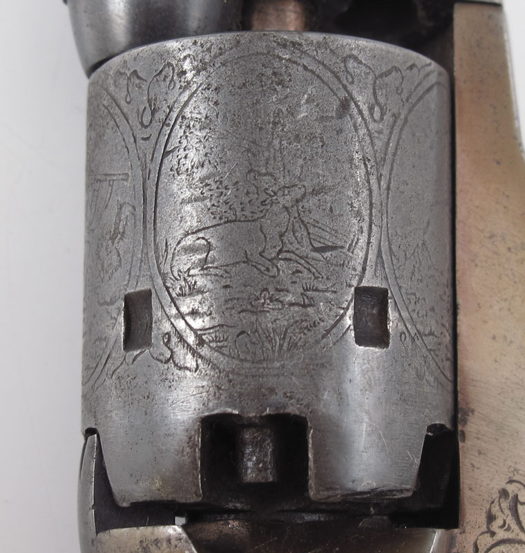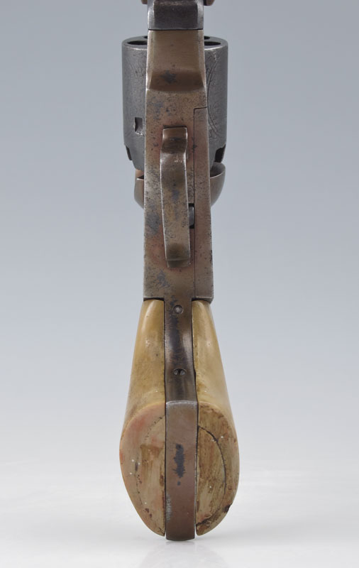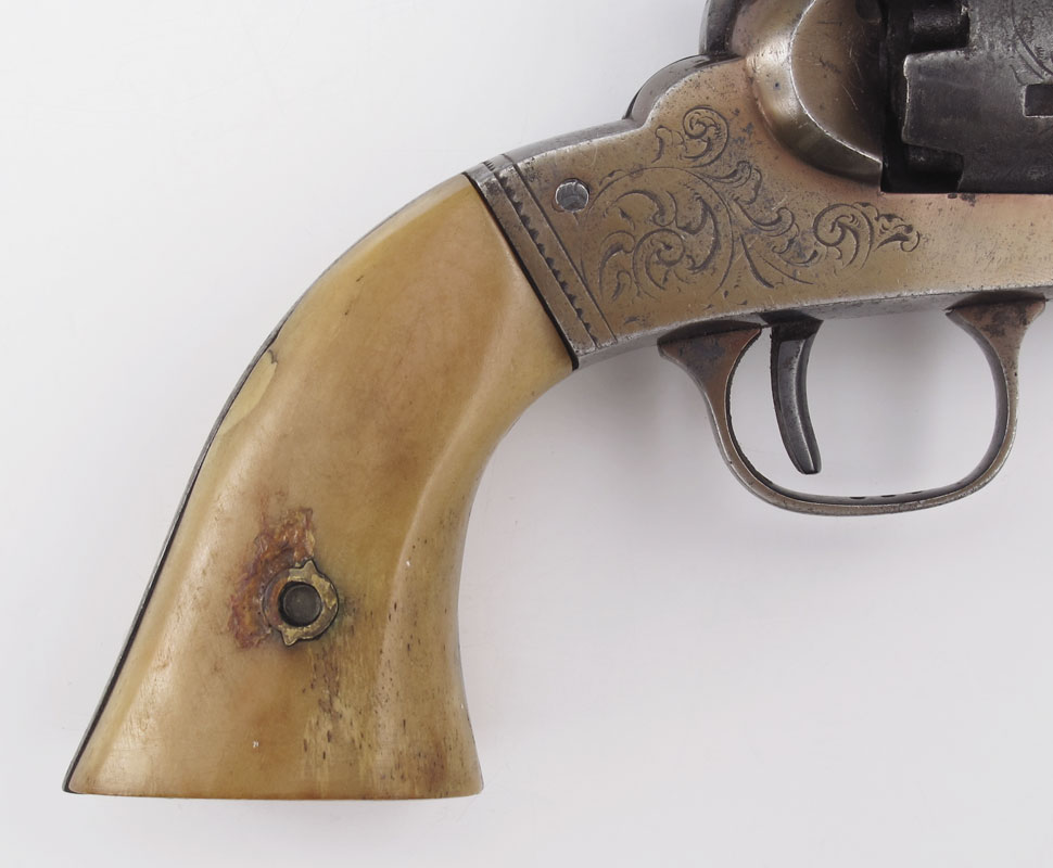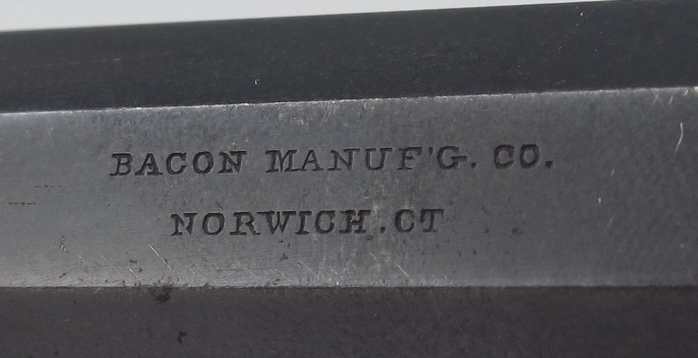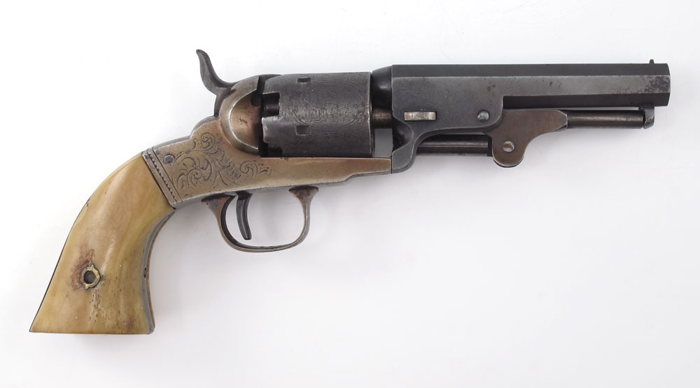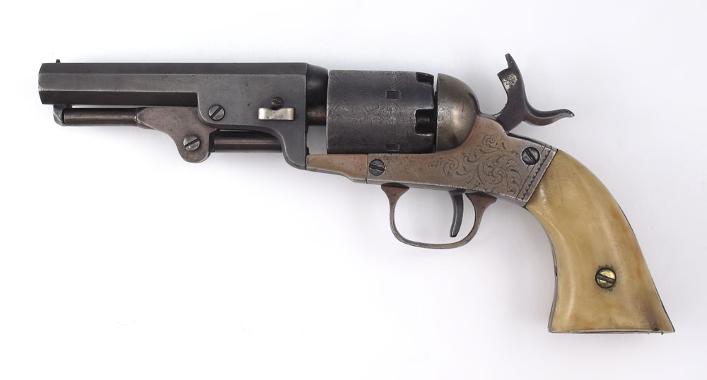 CIVIL WAR ERA BACON MFG. POCKET MODEL PISTOL: Circa mid 19th century .31 caliber Bacon Manufacturing Co. pocket model percussion revolver. Serial number 462 inside trigger guard. 5 shot cylinder with engraved scenes in panels. 4'' fluted barrel marked Bacon Manuf'g. Co., Norwich CT. Foliate scroll engraved frame. Horn grips. 8 3/4'' l. overall.