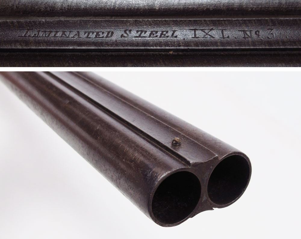 EDWARD MIDDLETON ENGLISH DOUBLE BARREL PERCUSSION SHOTGUN: 12 gauge double barrel marked Edward Middleton on lock. Laminated steel 32 1/2'' barrel and lockplate also marked IXL No. 3. Birmingham proof marks under barrel. Checkered wood stock with steel furniture. Replacement cleaning rod. 48 1/4'' l. overall.